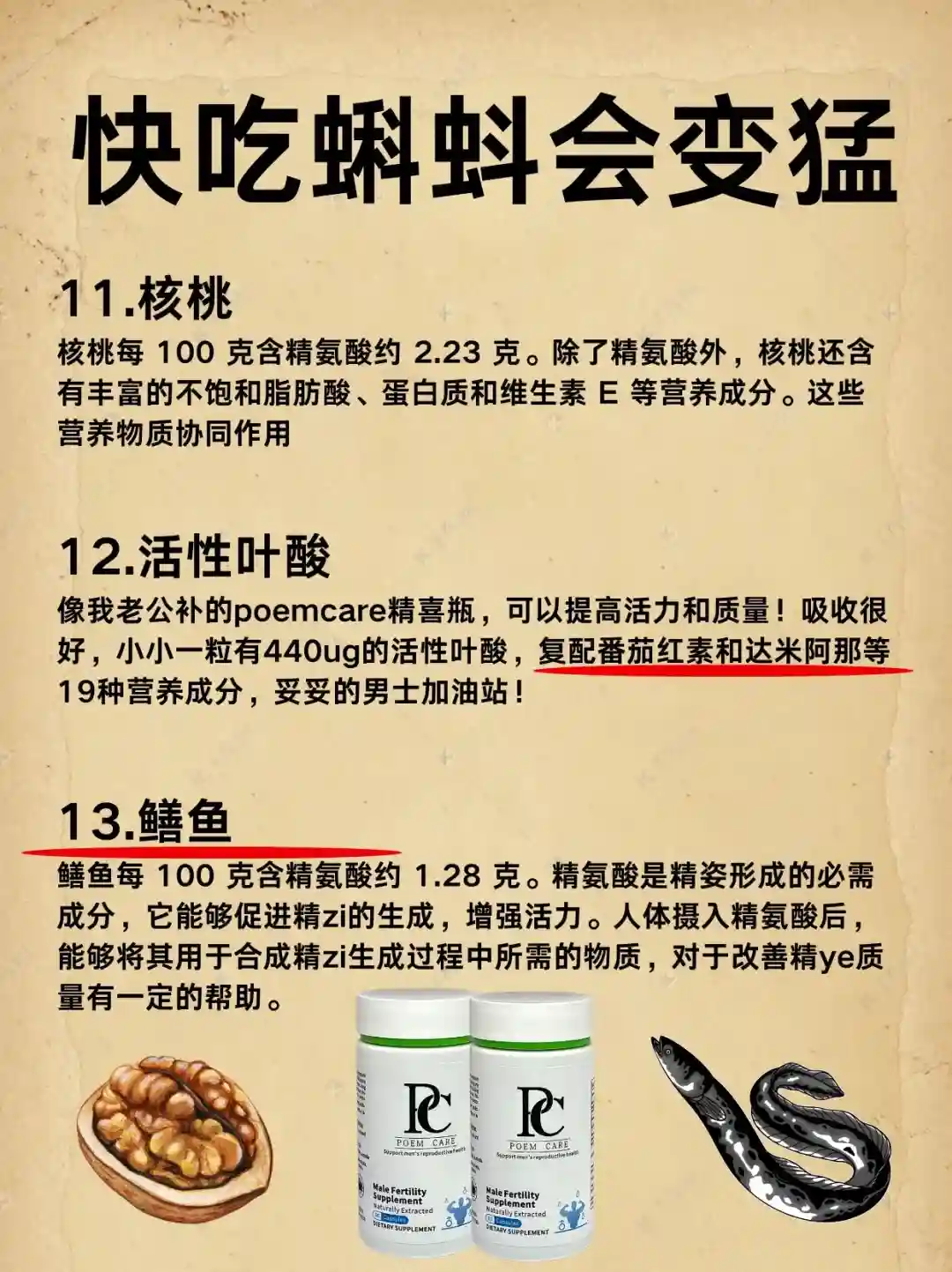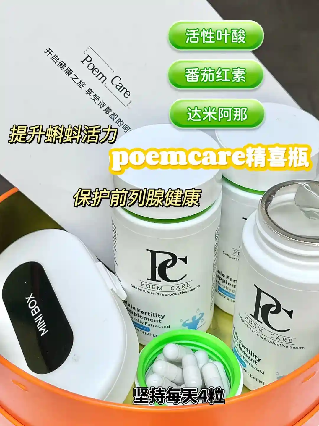 4.活性叶酸,像我老公补的poemcare精喜瓶,可以提高活力和质量!吸收很好,小小一粒有440ug的活性叶酸,复配番茄红素和达米阿那等19种营养成分,妥妥的男士加油站!