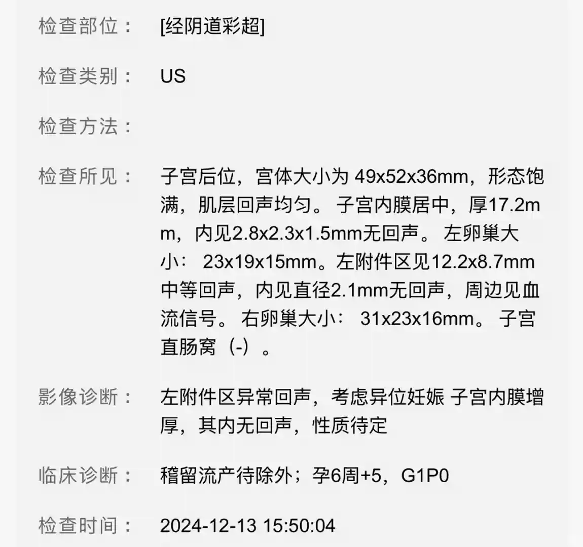 12.13医院检查hcg和孕酮,hcg翻倍差一个星期只涨了二百多,孕酮比一个星期前还低了,做Y超被怀疑有可能是宫外,紧急安排了住院,昨晚上不知道什么原因肛门附近下坠疼又做了Y超,内膜比刚入院时薄了,包块10.4✖️9.9mm,入院当天hcg745,昨晚上降到了700