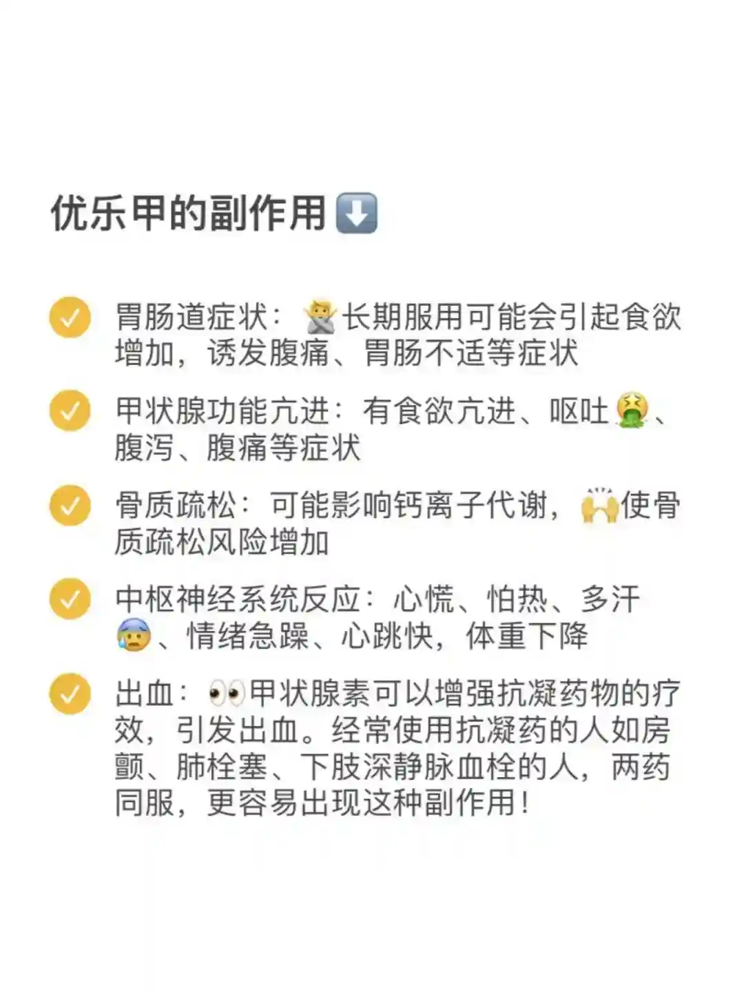 ⚠️关于长期服用优甲乐可能会有些许副作用,但是影响不大,如果出现副作用,应及时去医院检查,听从医嘱,看是否减少用药❗️
