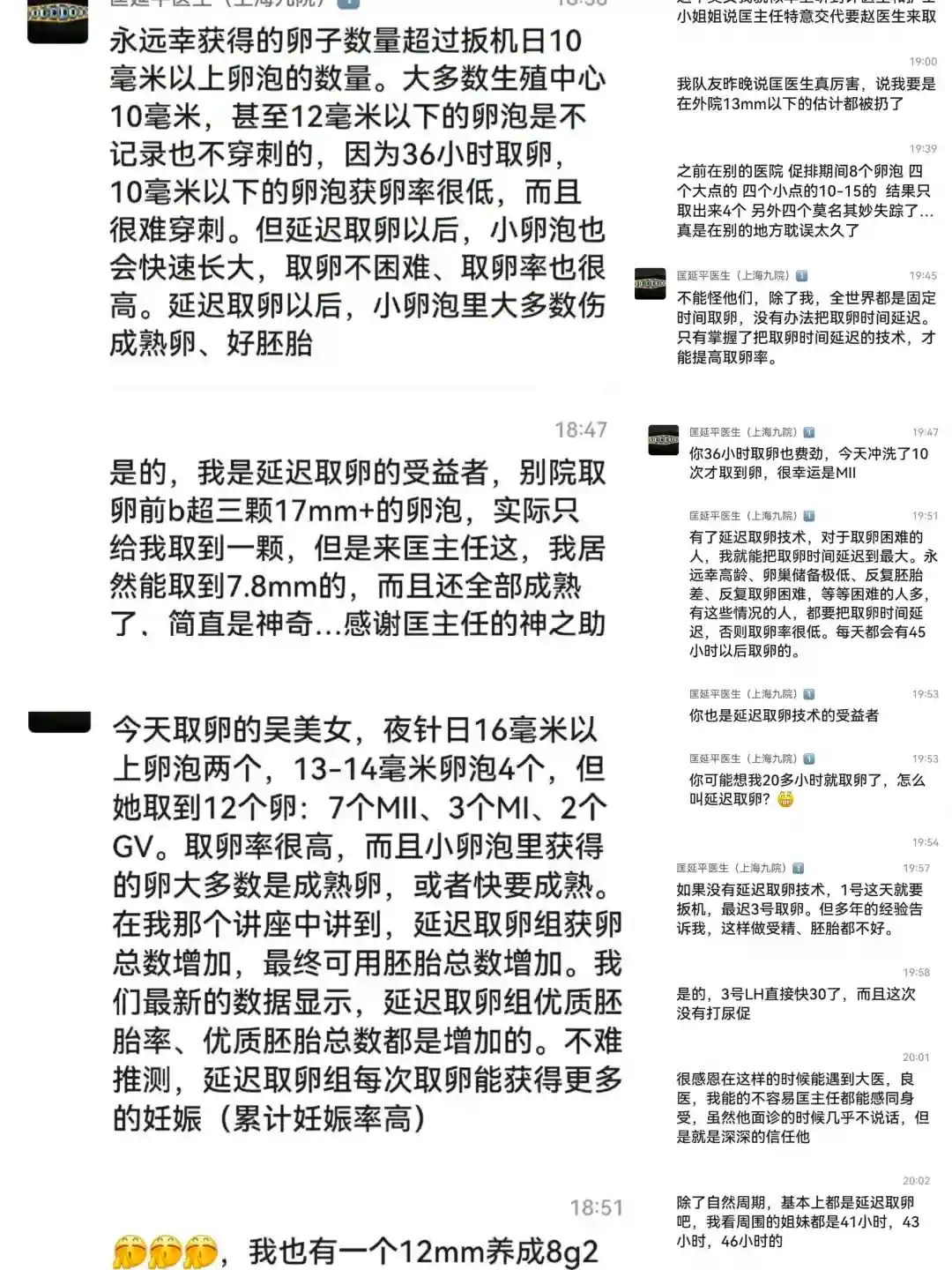 促排第11天,也就是夜针当天只数了左边4个(16.5,16,13.5,9)和右边9个(20.5,20,16,15,11,10,9.5,9,9),部分小的也就没有数,按照这个情况预计能取的只有7个。但舒主任决定运用延迟取这个方案,夜针时间是17:00,隔天中午11点再取,间隔42个小时,希望小的也能成熟。