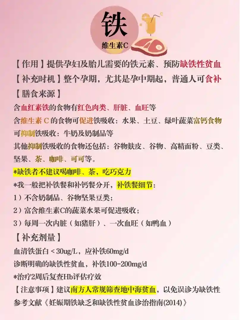 🩸铁(+维生素C)孕中期开始,尤其是缺铁贫血者🌟每周一次猪肝、一次鸭血+
