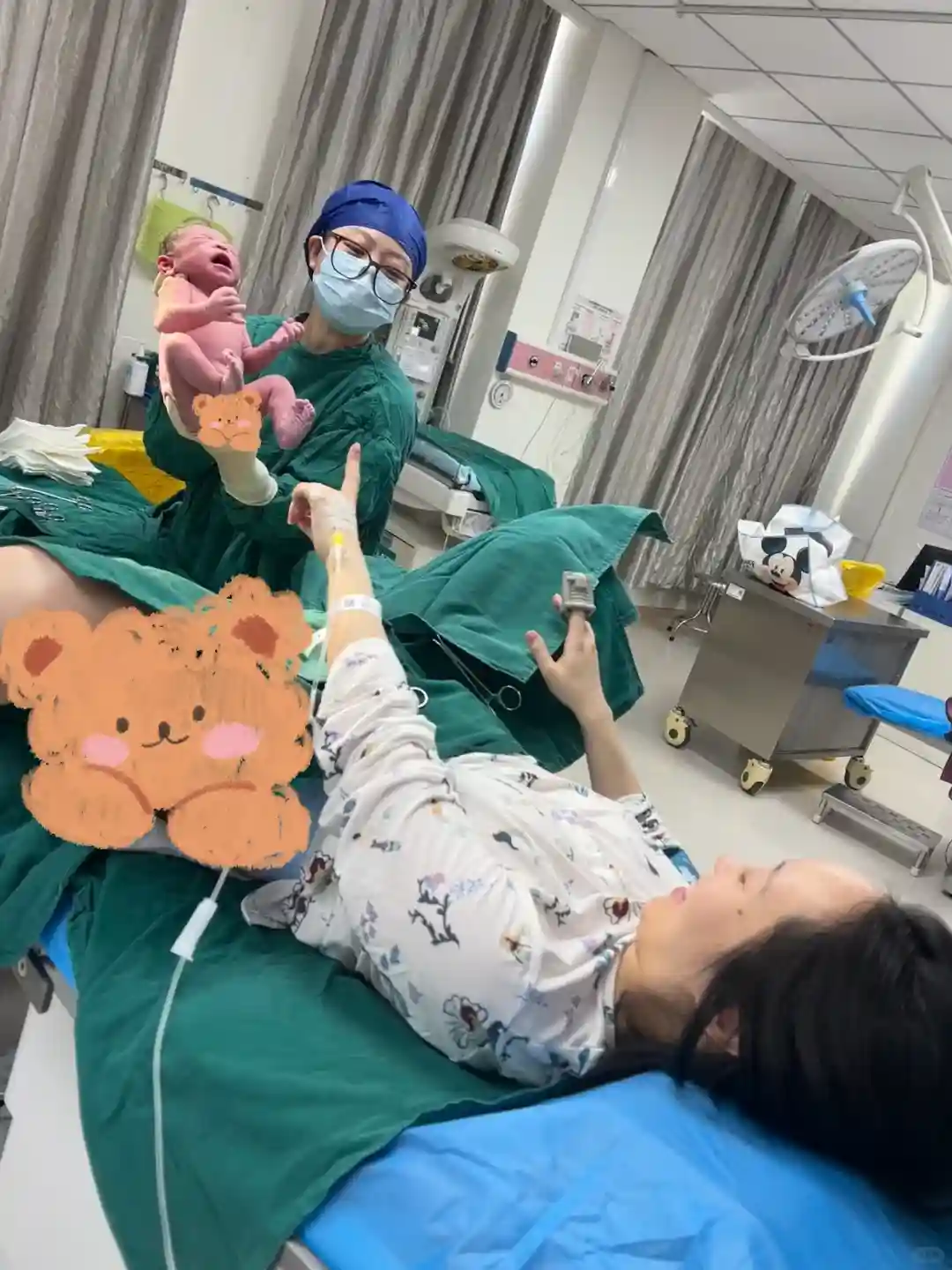 ❗️感谢无痛分娩,在感到一股清泉顺着腰部流入身体之后,我的痛感明显减轻了。躺床上小睡了片刻,醒来医生说可以准备生产了。护士教我发力,“待会儿宫缩的时候,吸一大口气憋住,下巴微收,双脚用力蹬着踏板,双手扶在把手上向后拉,整个人用向下坐得力把孩子娩出来。”整个产房就我一个人生产,身边大概有五六个护士在边工作边陪我聊天,氛围很轻松,护士长还非常友好得主动帮我记录了生产过程。把无痛分娩安利给所有想要顺产的姐妹!人类之光!