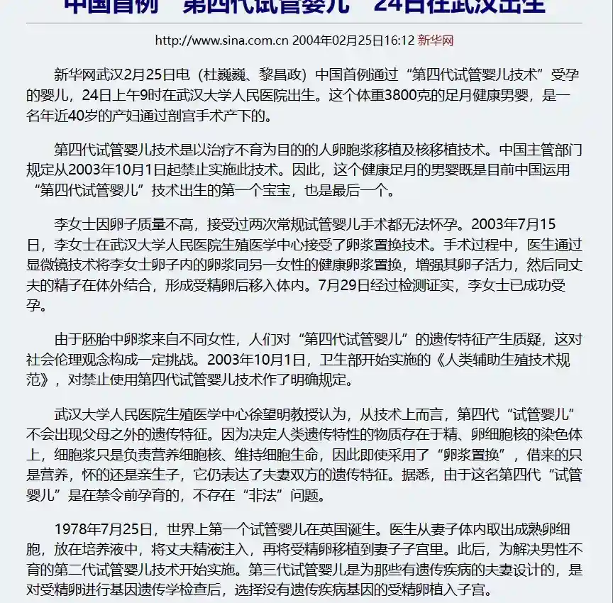 第四代试管婴儿技术是以治疗不育为目的的人卵胞浆移植及核移植技术。中国主管部门规定从2003年10月1日起禁止实施此技术。因此,这个健康足月的男婴既是目前中国运用“