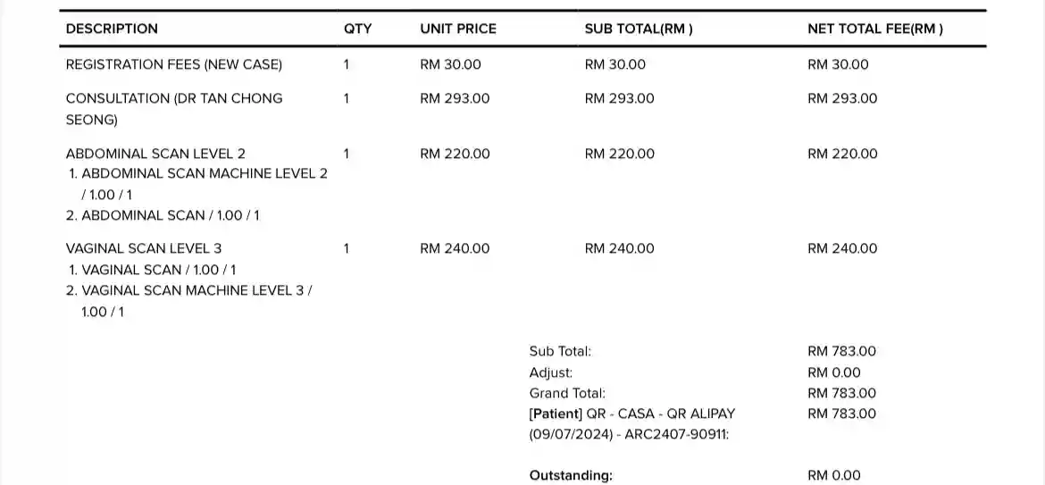 2.对接人员消失。一直对接我的中文护士竟然没空见我。之前让我来见面的是她,说没空的也是她。我微信问她是否有空见面时她回我的消息是“没时间 有很多事需要处理”,无语住,明明我已经预约了!3.账单疑问。我出医院时没有任何人跟我说需要付费,等一两个小时后才通过微信发信息让我缴费。我用alipay交了钱,一共是783马币(贵!),我向医院要收据,医院说alipay会延迟,第二天他把收据给了我。收据里写了黄体酮,但是我并没有开药。我问医院,医院竟然立刻撤回说这是别人的单子,他发错了。过了一会儿又发了一张收据给我。第二张收据没有药物,但是每个单项价格都比第一张收据上的贵。只可惜第一张收据我没有截图。我都怀疑是不是医院搞错了,然后为了让总价保持不变,把药费平均到了每一项检查中…
