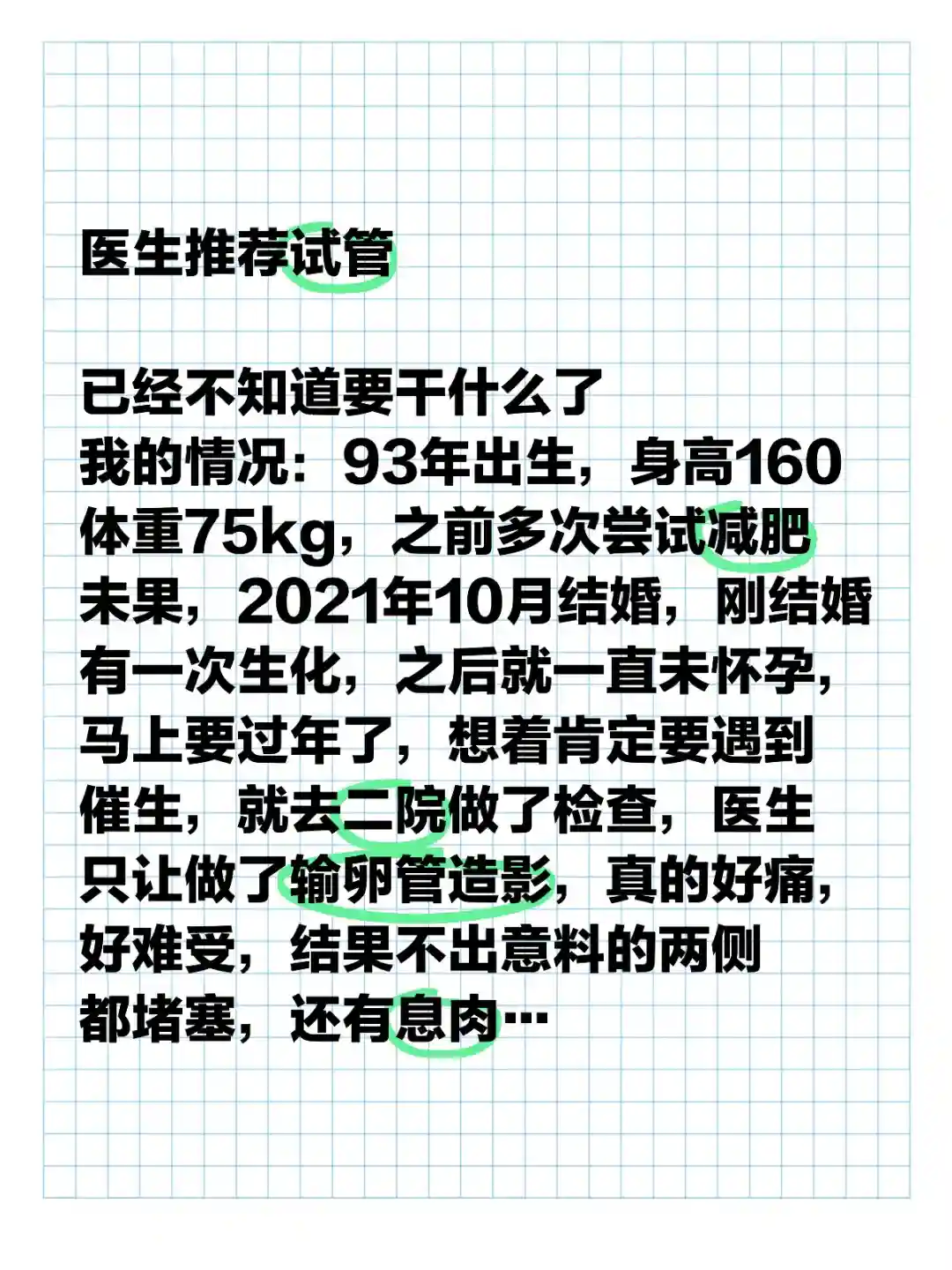 我的情况:93年出生,身高160体重75kg,之前多次尝试减肥未果,2021年10月结婚,刚结婚有一次生化,之后就一直未怀孕,马上要过年了,想着肯定要遇到催生,就去二院做了检查,医生只让做了输卵管造影,真的好痛,好难受,结果不出意料的两侧都堵塞,还有息肉,医生建议,先做宫腔镜手术去除息肉,然后做试管,费用三万以上,成功率只有50%现在我只知道我要减肥,其他的真的不知道该怎么办了,谁能给我一个建议,能不能不做试管,石家庄的医院,医生有推荐的吗