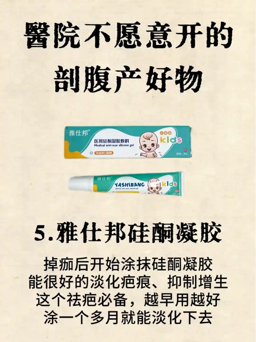 ➡️雅仕邦硅酮凝胶,它里面医.用硅酮成分很足~,可以淡化疤痕、预防增生,我当时用的时候已经有点增生了,用了之后没有继续增生了!而且坚持下来疤痕真的淡了!每天早晚两次,哺乳期也可以放心使用!!