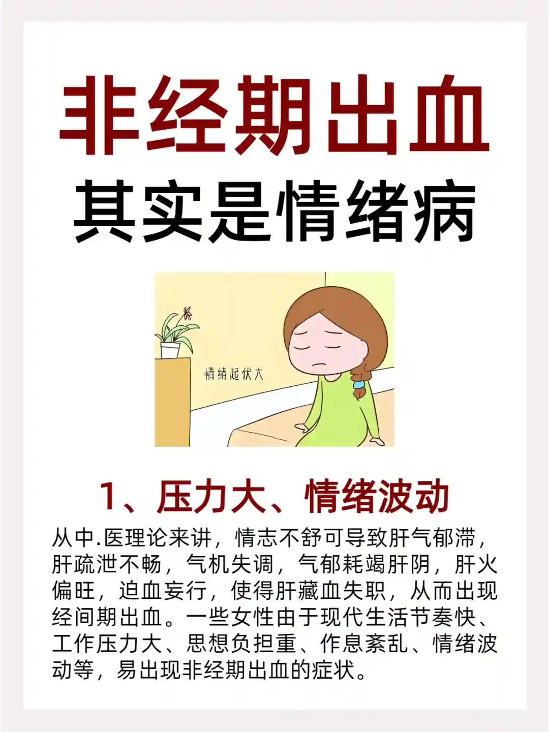 从中.医理论来讲,情志不舒可导致肝气郁滞,肝疏泄不畅,气机失调,气郁耗竭肝阴,肝火偏旺,迫血妄行,使得肝藏血失职,从而出现经间期出血。一些女性由于现代生活节奏快、工作压力大、思想负担重、作息紊乱、情绪波动等,易出现非经期出血的症状。