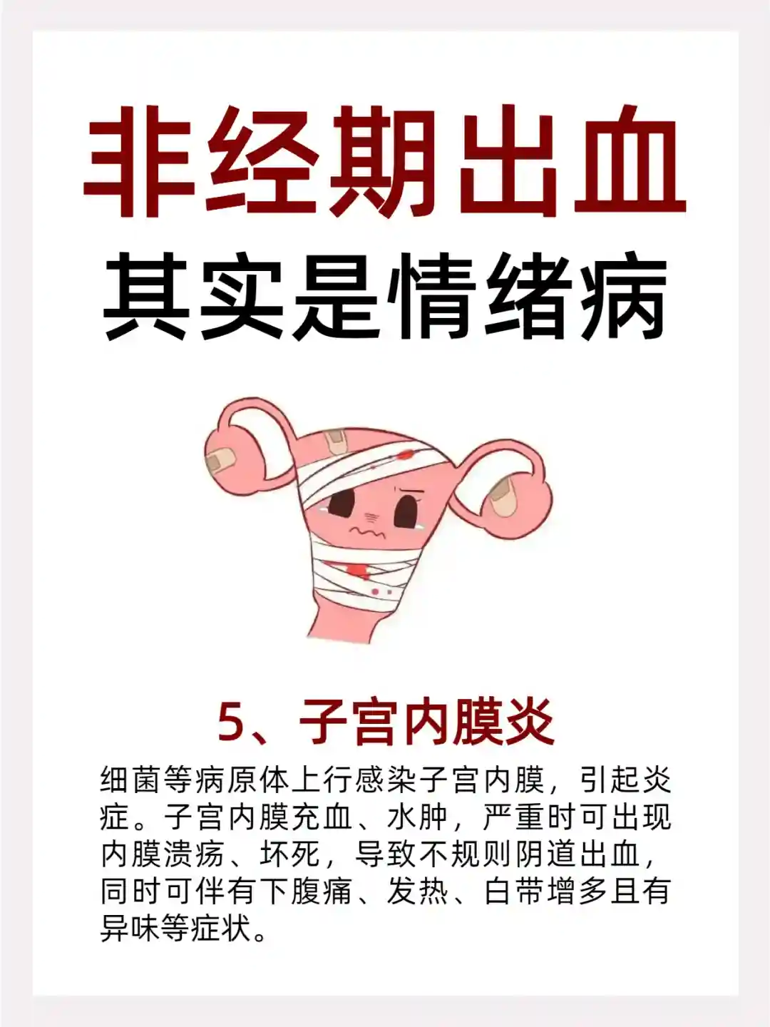 7、子宫内膜异位症:子宫内膜组织出现在子宫体以外的部位,如卵巢、盆腔等。非经期出血可能是由于异位内膜组织局部出血,混入盆腔积液中,表现为yin道少量出血或血性分泌物。