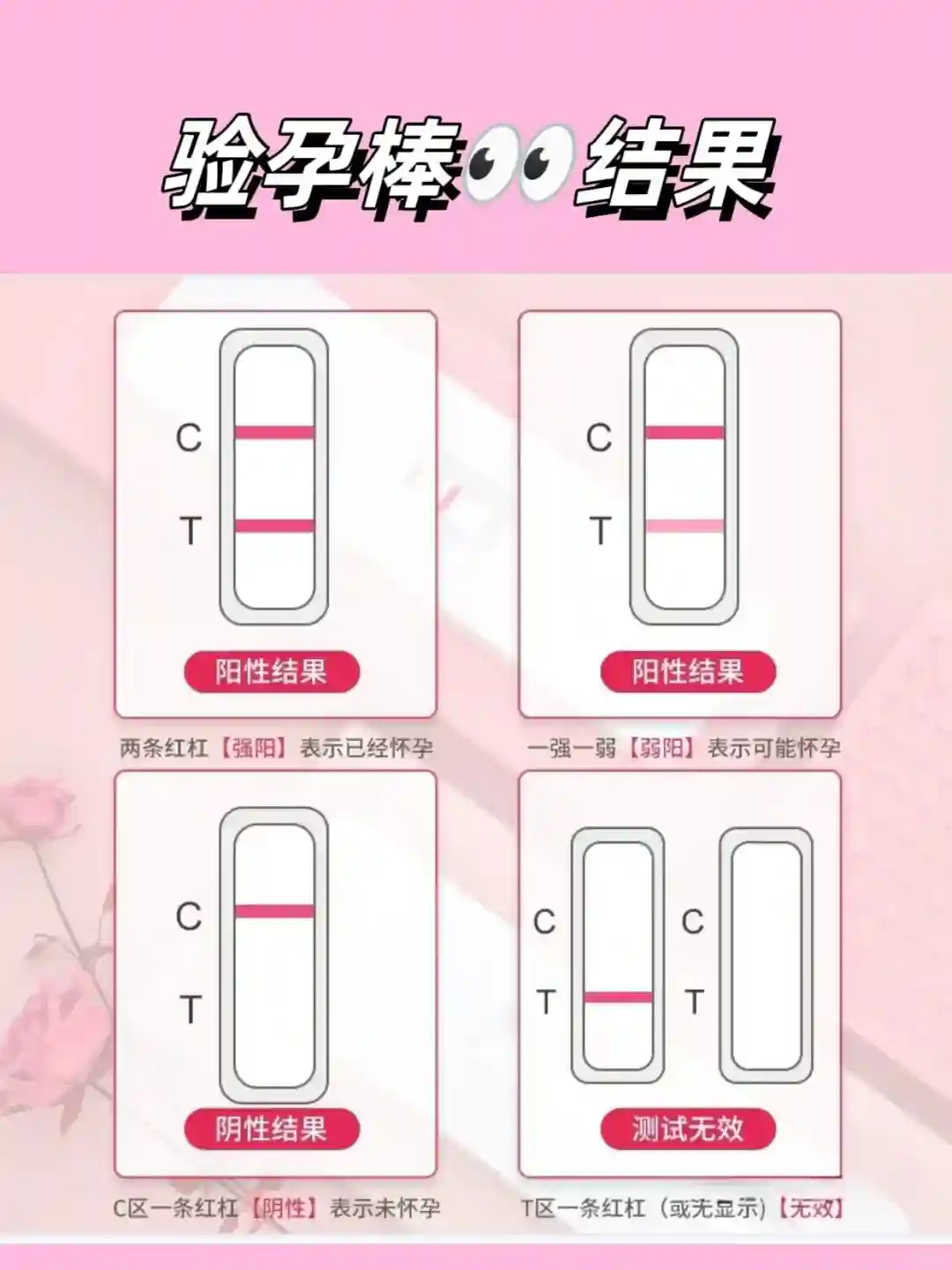 👉🏻2. 已怀孕:要是能看到两条线,也就是对照线(C)和检测线(T)都显色啦,那这时候就要仔细看看检测线(T)的颜色情况哦。如果检测线(T)颜色很清晰,那恭喜呀,这就是已经怀孕了,属于阳性的结果呢;但要是检测线(T)颜色比较浅的话,那就表示有可能怀孕哦,这种情况建议 2 天后用晨尿再测一次哈,这就是弱阳的情况啦。