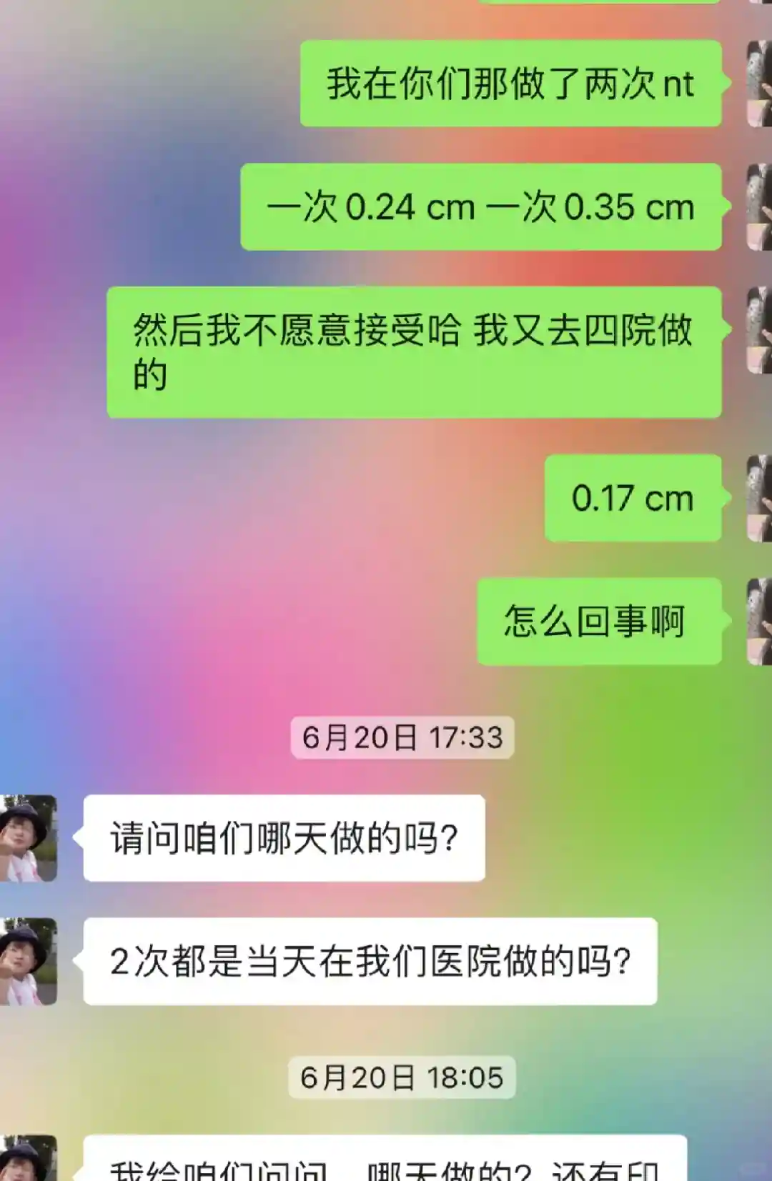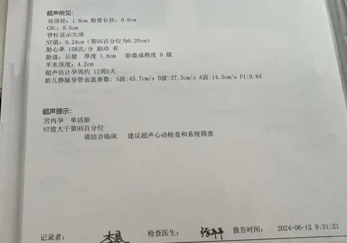 因为我一直在生殖检查 感觉他们那服务好十楼不排队!然后等着nt的时候第一次去 2.4 说超了第95百分位了,去了产前诊断说建议复查,我的数值如果建档免费无创应该不给做,然后就约了一周后复查,结果nt更大了0.35cm 产前诊断说建议绒穿或者羊穿,无创都不管用了。当时我就崩溃了,从医院出来我接受不了直接挂号四院我想再检查一下 当时已经中午了 我下午去四院做的 结果0.17cm 正常范围内