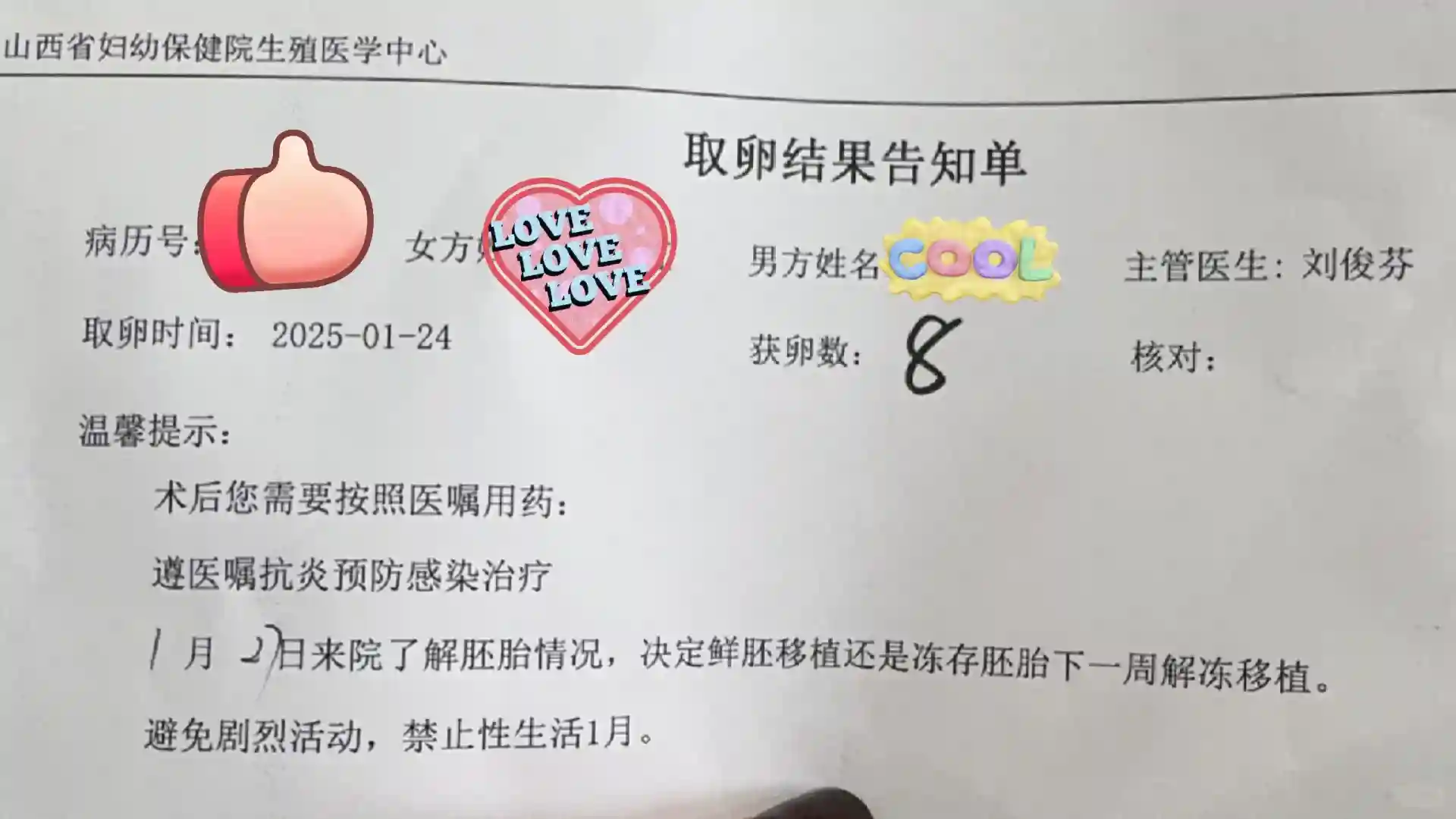 早晨7.30 直接去门诊东四楼排队登录信息,夫妻双方一起,带好身份证,户口本,还有病历本~ 打麻药的话,需要先去护士长扎针,是留置针。 留着取卵室喊名字进去就可以。 取卵的注意事项上一篇图片有,取卵前要休息好哦,取完之后要注意休息,补充高蛋白实物。