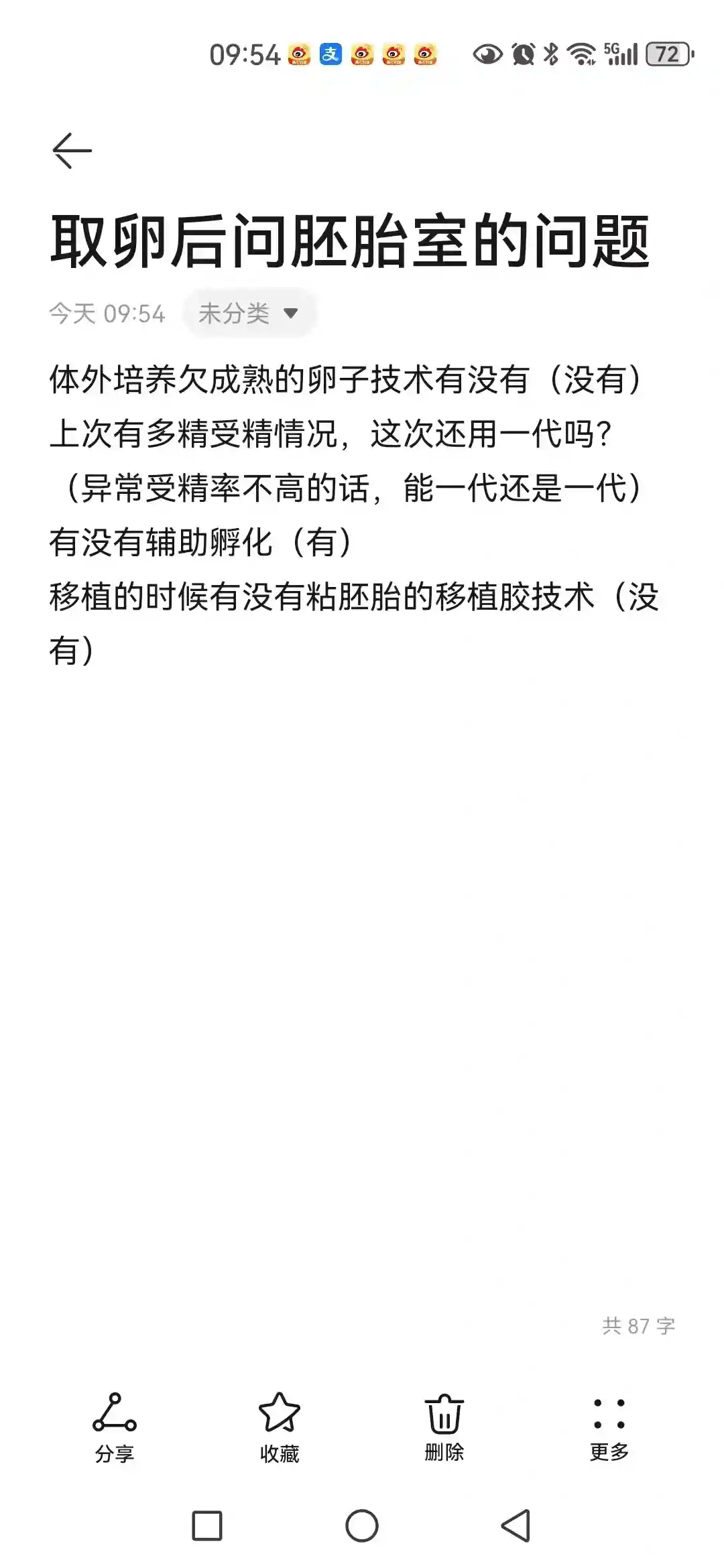 一促长方案,比之前的医院有进步,得到囊胚一枚,遗憾还是没有着床。二促换方案,取完了还不知道结果。于是在取卵后问了胚胎培养医生几个问题(图一)。当时就觉得这个医院也不过如此嘛,一直引以为豪的实验室,居然不能体外培养欠成熟的胚胎,以及没有胚胎胶这种技术。像我们这种高龄本身基础卵泡就不多,促排不是所有的窦卵泡都能同时长大,促排后期如果20左右大小的卵泡占比很高,那就会安排夜针了,那么那些16的15的也还算行的卵泡就没有机会继续促,那这个时候如果医院有体外培养欠成熟卵泡的技术,是不是对卵泡少的人来说是个福音?