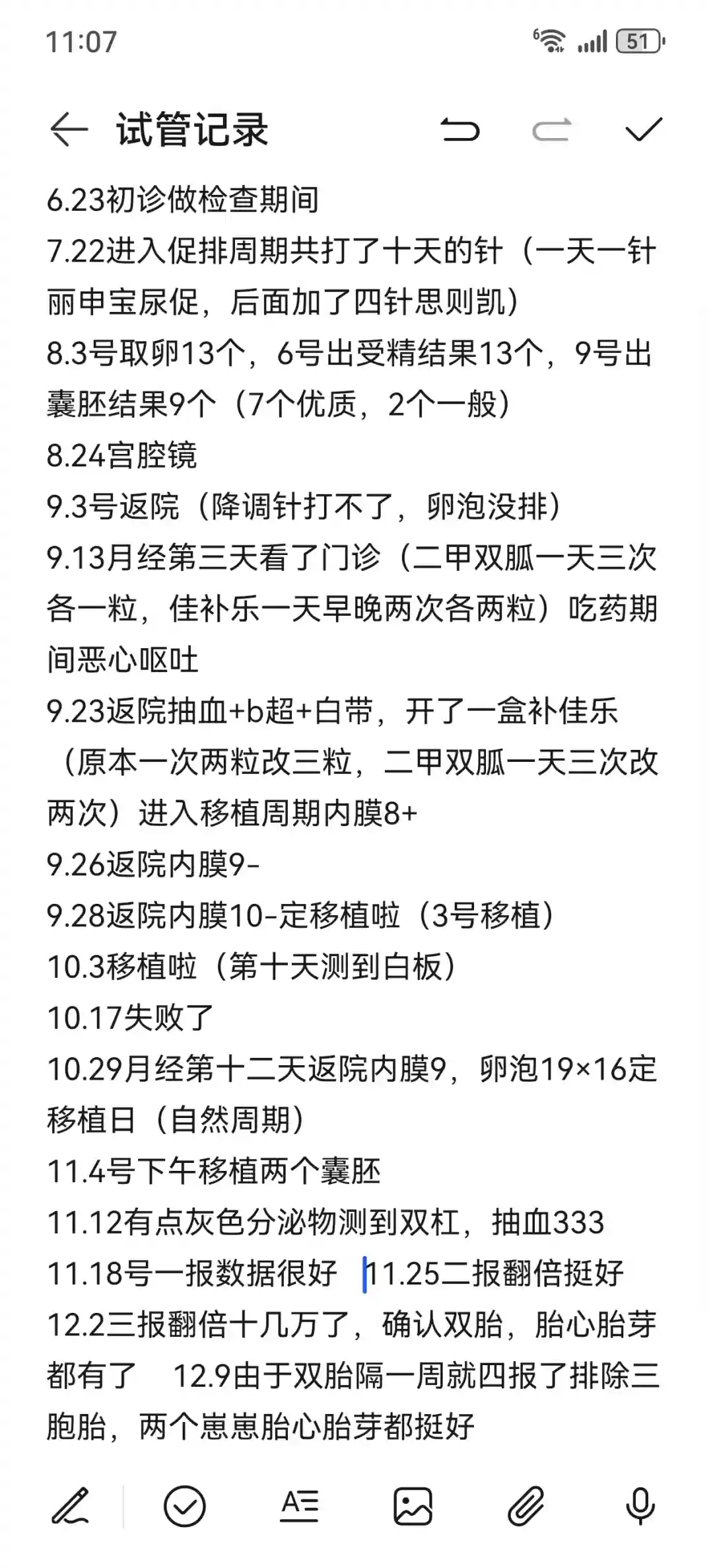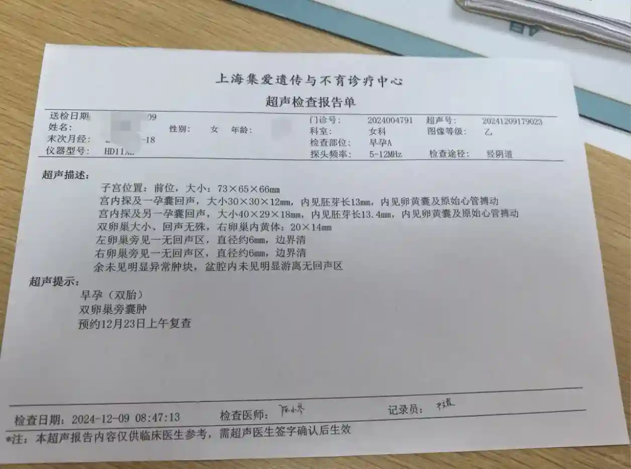 回头看一路走来挺不容易的,因为试管的每一步都很艰难,像是打怪兽一样在闯关,每次往前走一步就很开心,身体上打针的苦抽血的苦,都开始忽略不计了,因为我们只能往前走,坚强一点,刚促排时也不知道医生是采取什么方案,主打一个医生说啥我就去,刚开始担心取卵少,还好取了13个,取完后回家等受精结果,第三天返院坐在那里,就像是考试出成绩莫名紧张,听到全部受精了,10个质量很好,全部养囊了,又回家等了三天,坐那等着养囊结果,心里也是砰砰砰,我跟我老公我紧张,还好结果是好的,养了9个囊胚,7个优质,2个一般,具体什么等级也没问,取完卵喝一堆堆水,还好没有腹水,这算是闯过胚胎的关了,来了一次月经,后面安排了宫腔镜有轻微内膜炎,吃了十几天药,我庆幸以前的息肉没复发,宫腔镜的关也过了,开始等月经来,进入期待已久的移植周期,开始担心内膜和其他问题不达标,还好,内膜各方面都挺好,终于确定了移植日,我老公那天也很紧张,我倒是心情特好,还带了旺仔牛奶棒棒糖,接宝宝回家,我信心十足,觉得这次应该能成功,当听到同天移植的人测出来了,我实在没忍住是大白板,那个心情一下子掉下来了,可我还是抱着侥幸心理,心想再等等万一第十天可以测出来呢,第十天还是白板,我知道失败了,心情很低落,甚至想摆烂了,可是收拾收拾好心情,又安慰自己继续二移吧,到了第十四天一报返院,看到血值那个心情确实不好受,今天看医生后心情好多了,反而有信心了,医生说胚胎的发展潜力是看不出来的,一批胚胎中总有好的和不好的,不要去质疑自己的身体,说下次放两个囊胚,增加成功率,我回家了,一移走的人工周期,这次说走自然周期,没想到格外顺利,按道理说自然周期返院次数多,可是我就月经第十二天返院一次,就定下11.4号的移植日,可能是二移了,心里平和了许多,也没带旺仔牛奶,但还是挺高兴接两个胚胎宝宝回家,回家后躺的比较多,躺累了就起来走走,上厕所吃东西啥的,我想这次我不提前测,到第十天吧,结果第八天早上我感觉塞的药渣里面有点灰褐色,心里害怕,测了一下秒红了,心里既高兴有担忧,麻溜的去附近医院抽血,但后面还是有点出血,医生说着床出血不要紧,可自己还是担心,隔一天就去看翻倍,我发现翻倍很好,甚至怀疑有可能双胎,但面临的孕反也很早来临,后面返院都挺好的,b超也看到胎心胎芽了,我才真真切切的感受到我怀的是双胎,希望一切顺利,在试管路上的姐妹都能苦尽甘来#集爱试管