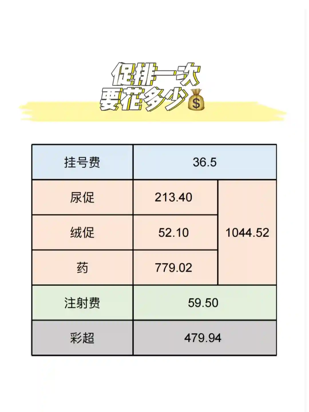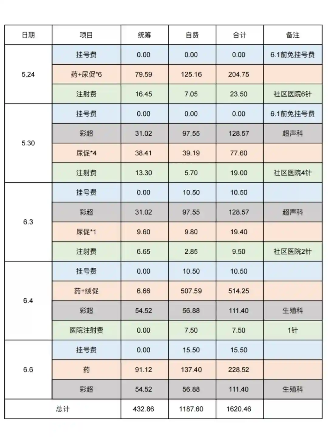 历时14天,打针12次,彩超4次,请假5次;促排总花费1620,其中医保统筹433,自费1187。除此之外,两次公共交通花费13。