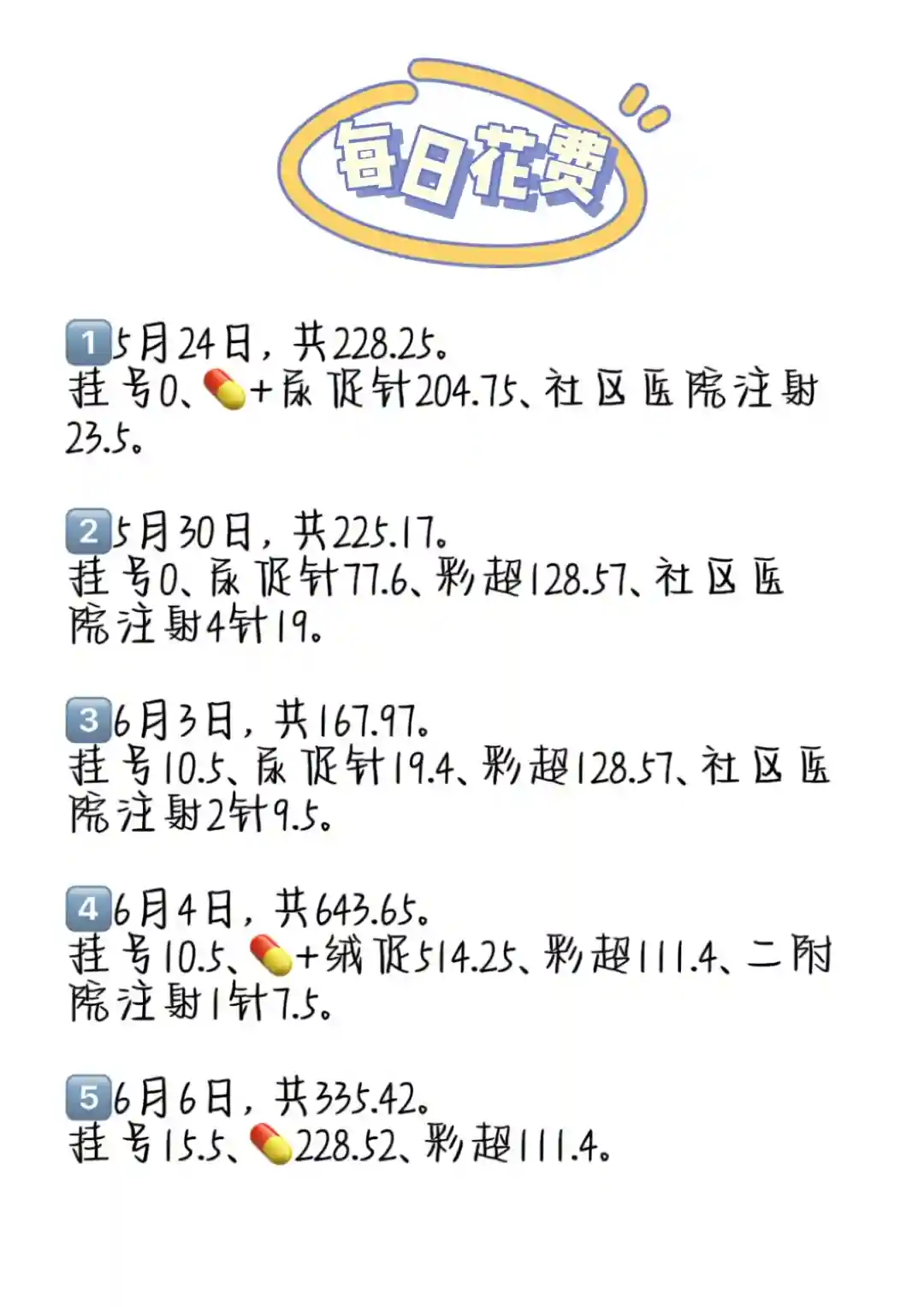 挂号0、尿促针77.6、彩超128.57、社区医院注射4针19。