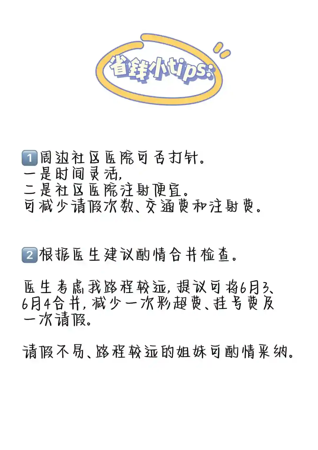 2️⃣根据医生建议酌情合并检查。医生考虑我路程较远,提议可将6月3、6月4合并,减少一次彩超费、挂号费及一次请假。