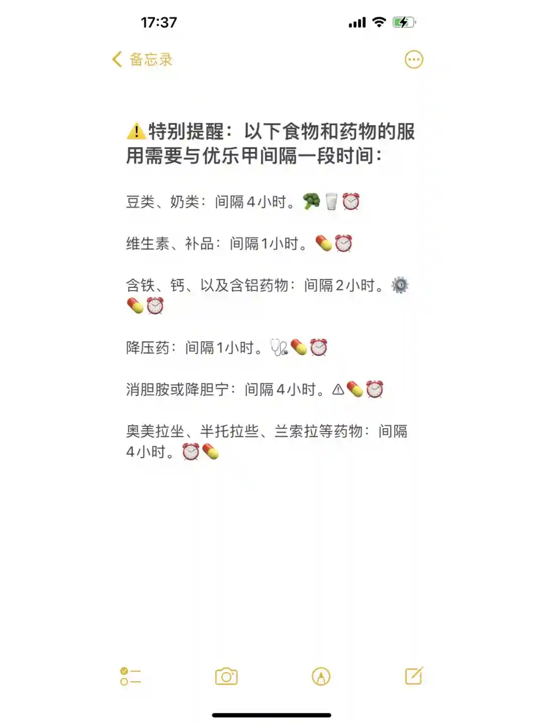 2️⃣ 在服用优乐甲后,要与某些特殊药物💊或食物保持足够的时间间隔,例如含有大豆成分的食物、高纤维食物。