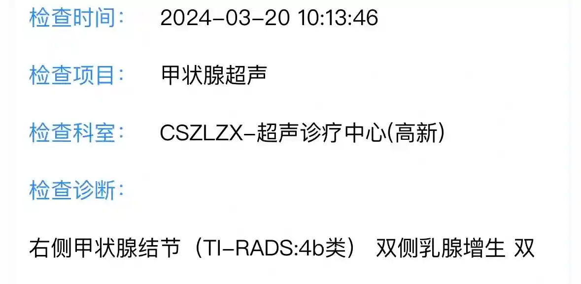 3.20按部就班的检查,没想到晴天霹雳,我的甲状腺B超提示可能有恶性结节,当时赶紧在手机上预约了当天甲状腺的专科医生看诊,医生说要穿刺,紧接着就是约穿刺,遇到一个神仙医生,高新区约不上帮我约的南区,下午又赶去南区,顺利的约上了3.21的穿刺,早上七点就到了排队,第二个做的,很紧张,但是不怎么疼,一天都很忐忑,等报告的过程真的很熬人