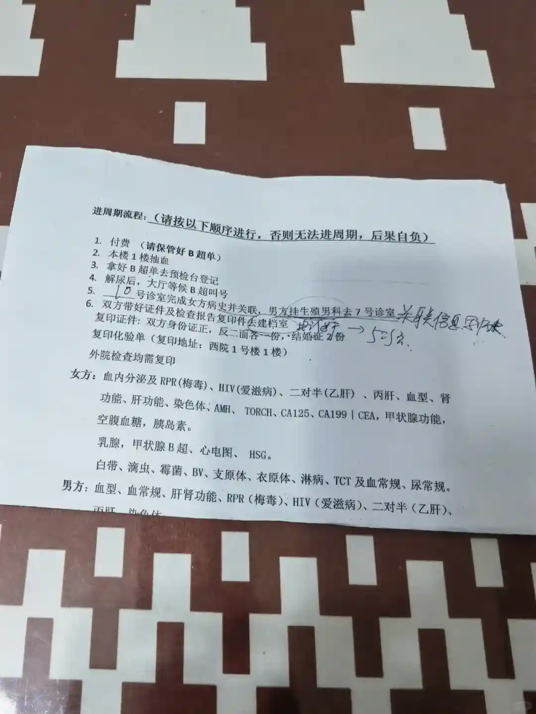 护士会给一张纸上面有接下来要做事情的流程:付费-抽血-b超-男女方写病史(有老公身份证就可以代办理)-建档(老公因为没来所以他的掌纹可以等周六25号来补),上午结束,等报告出来下午听报告及拿药,听说只有这次需要耗一天的时间,下次抽血b超及听报告只需要半天时间,前提是早上尽早完成抽血。下午1点半护士会给下一次的抽血及b超单,缴费后拿着医生开的处方单在药房把需要吃的药和打的针领回来,护士会告诉你哪里可以找到打针教学视频,好好学习自己打,之后再次返回医生那,会比较详细告知药怎么吃,针怎么打,以及第三次复诊的时间(12.28号)。