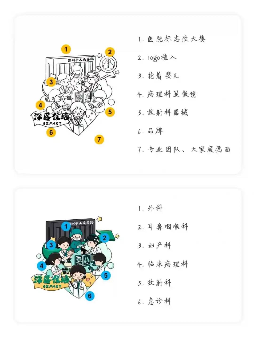 ✅这次的项目,品牌方除了要突出医院外,还希望把不同的科室尽可能的展示出来,每个科室的医生都有特殊的仪器和特点,需要策划不同的形象和选取标志性仪器,对图案设计的挑战还是很大的。设计过程和思路分享出来了,希望喜欢!