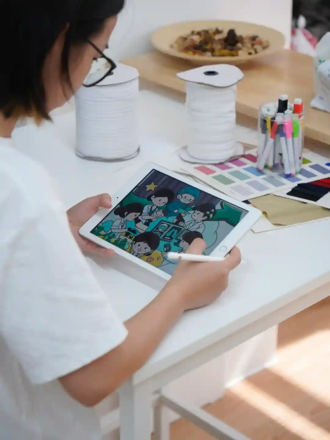 ✅文化衫图案设计,整个画面,我们除了体现年轻,通过人物服装和器械,以及构图的细节,把专业和有医院是个大家庭的感觉营造出来了。更多的,大家可以看看分享出来的草图,以及上色后的设计图。