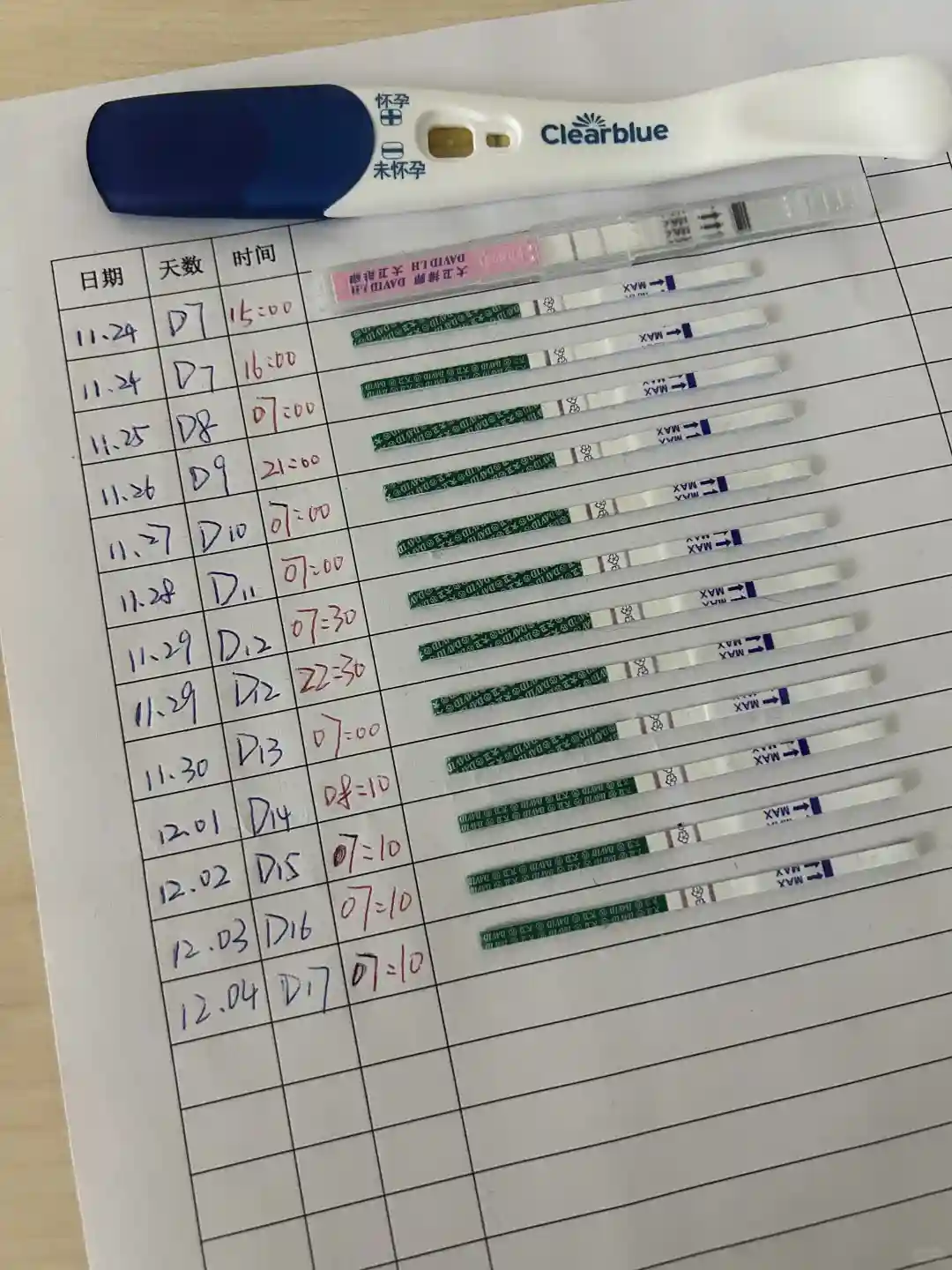 小红书说降调后如果着床了排卵试纸会强阳,我实在不敢测,于是用了排卵试纸先试试水。结果是强阳!后来买了验孕试纸,连测了好几根,手都是抖的……我的宝宝终于来找我了……
