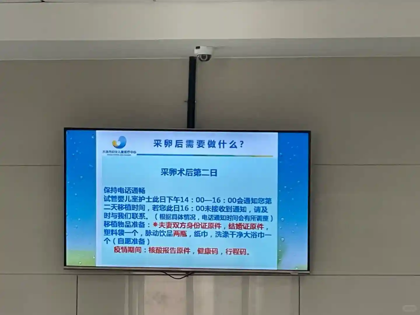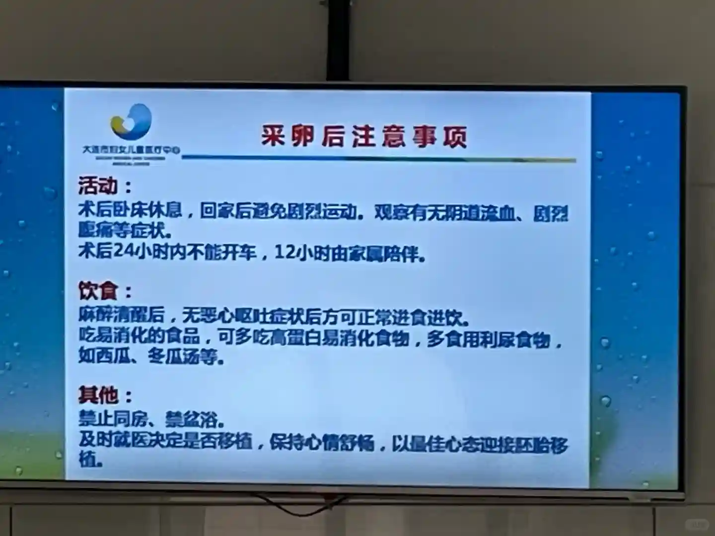 冲洗结束后又回到1号楼三楼进行宣教其实就是告诉你准备什么,口述流程。准备:身份证,结婚证,麻醉单,精卵去向单,入院通知单我是电子版的,装鞋的袋子一共这些,预备小毯子,纸巾和姨妈巾和大大的脉动,怕低血糖的带点巧克力啥的,当天晚上早点睡觉不要紧张。5.15取卵日,6.50之前到新妇幼的1号楼三楼,男士吃个饭吧,等待的过程中买个包子就造了,女生忙碌着检查需要的证件,女生左手腕写上夫妻双方名字,等护士来后排队检查证件录指纹发腕带后进到了取卵的大房间,先是更衣室换衣服,然后又是冲洗也不疼,不过卵泡发育的问题导致的肚子疼也有,感谢我强壮的体格子,全程无感,冲洗回来埋留置针在胳膊这时候挂盐水冲洗血管不必滴的太快,玩会手机别紧张屋里的屏幕显示着取卵姐妹们的名字,要到你了广播会让你去排尿之后在取卵手术室门口等着,等见到了自己的医生,紧张瞬间全无,躺下后麻醉大姐咵嚓就把麻药推了让你秒睡,香甜一觉后护士叫醒你,去观察室躺会,并告诉你取了几个卵,无不适后慢慢下来回更衣处穿好衣服门一开,爱人直接小轮椅推你回病房,脉动顶上,我直接喝了一升➕一杯蛋白粉个把小时的吧,医生给你做个B超,有的姐妹出血了术后直接塞的纱布,我没有出血,B超是显示也很好无出血,男生也精液合格,收拾一下就打包回家啦#试管日记 #大连试管 #试管取卵