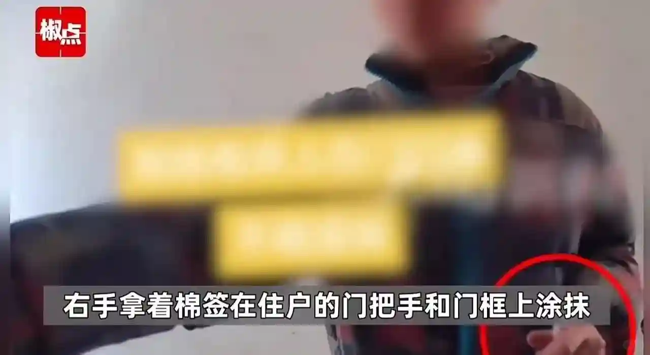 是一位居民家门装了智能猫眼,能自动录像并发送提示。当天下午两点多,居民在外面收到警报,打开一看,就看到那诡异一幕:陌生男人鬼鬼祟祟地把他家门把手和门框都涂上了不明液体后迅速离开。