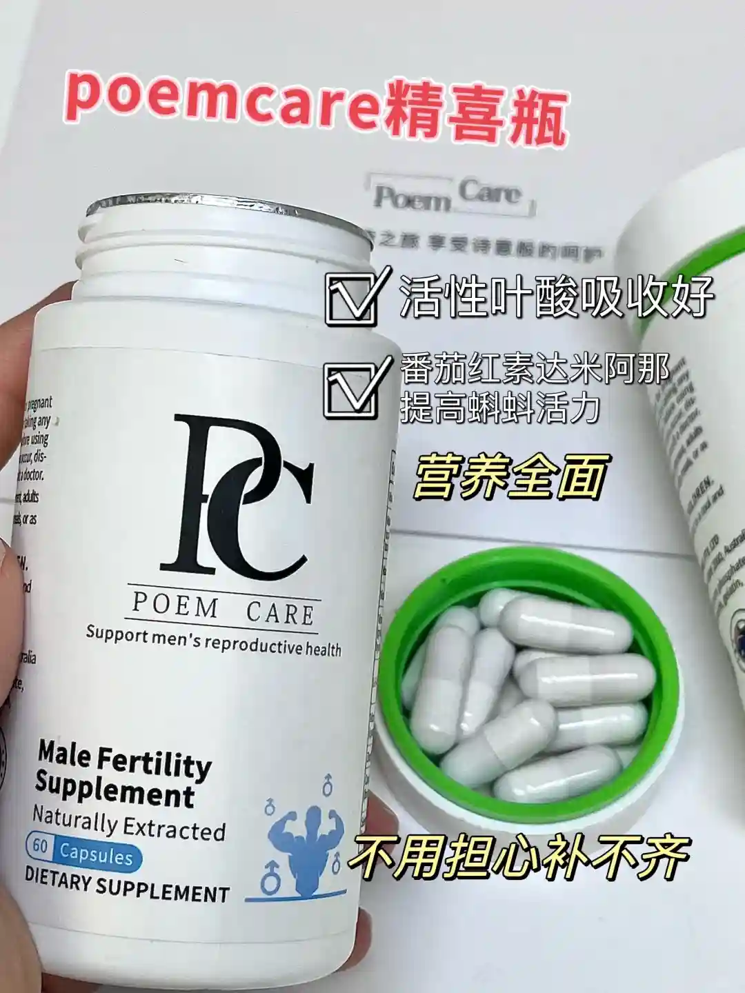 整理好心情,按着👩⚕的建议开始了早睡再起的规律生活,内服上给老公吃了poemcare精喜瓶,里面每颗富含440ug活性叶酸和达米阿那、番茄红素等19种男士所需营养,成分上会比其他单一叶酸更有优势,协同增效,补足营养,增强活跃能力,吃这一种就全都补充了,比较适合我们这种懒人。