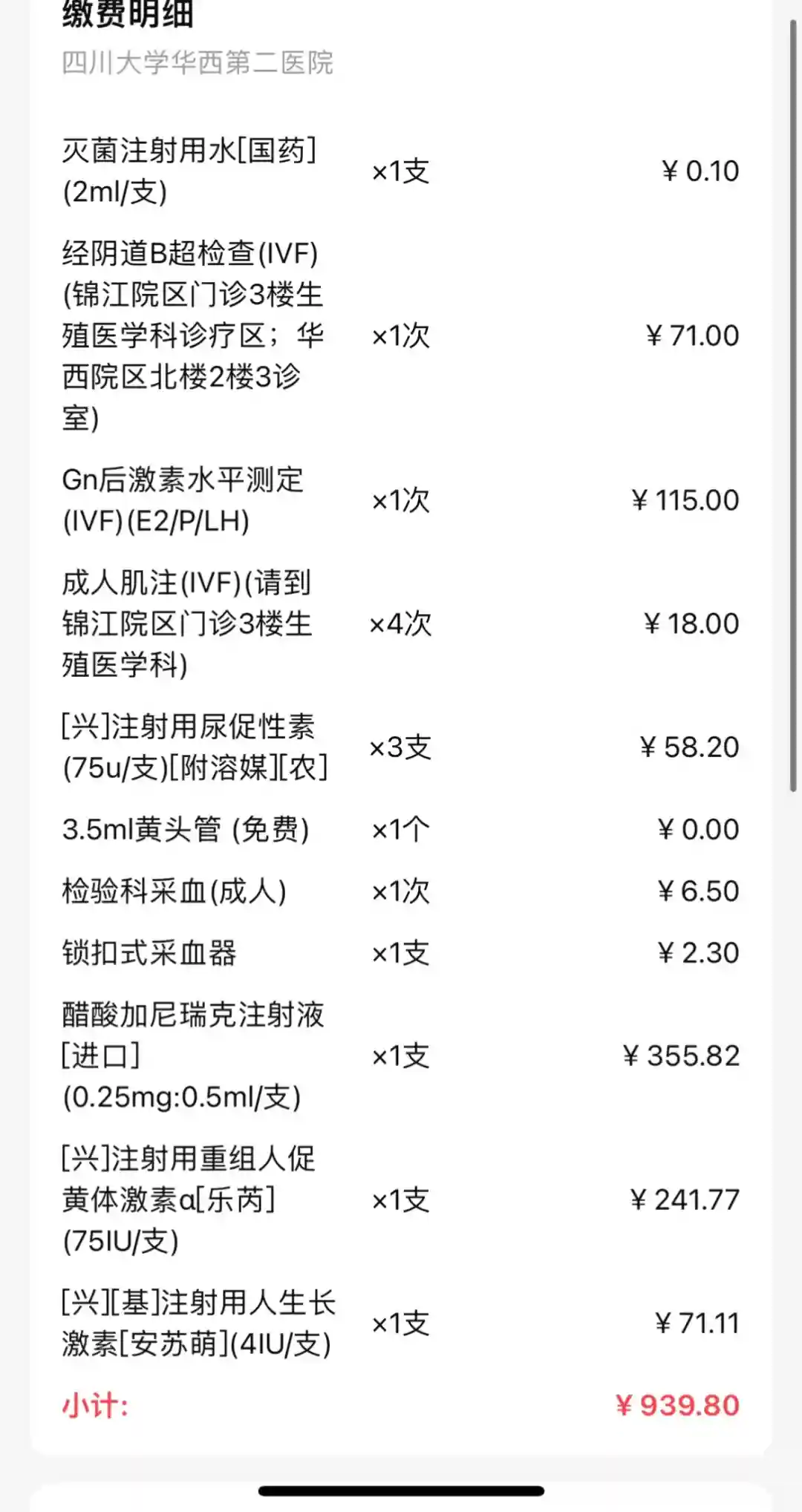 把抽血报告拿到就去看大白,大白让我等一下再给我打一下b超说不太均匀,大的大小的小再判断一下能否夜针,然后就把我带到另外一个房间重新打了b超,回来过后大白说把我的单子照给靳老师看一下,让靳老师判断是否打夜针让我出去坐着等一会儿,等了差不多一个小时听到了我的复诊号赶忙过去,大白说再让我打一天今天打4针,明天返院。好的又喜提四针,下一楼缴费取药,上三楼打针💉发现今天给我打了一针生长激素,全部弄完出医院阳光好暖和,我的宝贝啊乖乖长大等我来接你今日消费💰:939.8