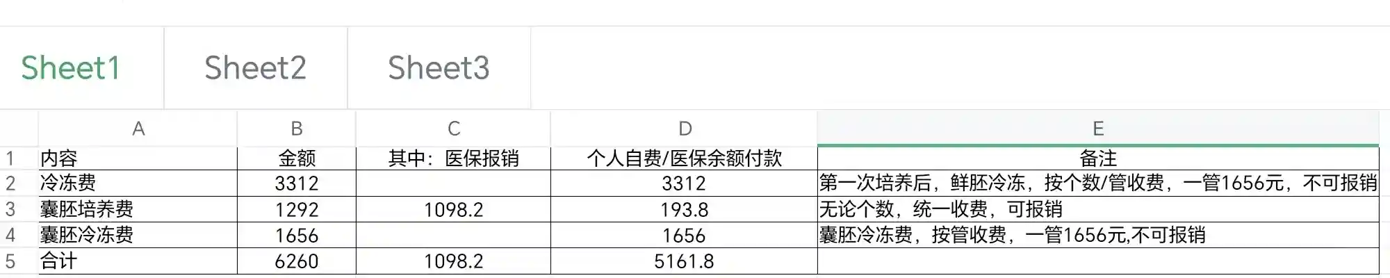 很久没来更新了,今天跟大家分享一下上次取卵之后的交费情况,上次取卵12个,我以为是很不错的情况,结果第三天去看胚胎(去前台说你来看胚胎情况,前台会帮你挂号,去固定的诊室等待),只有2个优势胚胎,1个0pn胚胎和2个胚胎(以上五个都是鲜胚状态),当时听到这情况感觉天都塌了,一半不到,一般无论多少个优势胚胎医生都会建议先冻2个鲜胚,一般一个一管(也有听说2个一管的,这里一管1656元,不能医保报销),其余继续培养成囊胚(无论个数,收费都是1292元,医保报销85%),再过4天看培养结果,后面3个成了一个(此时直接移植的叫囊胚,继续冻起来就是冻胚),一样一管收费,不可报销。