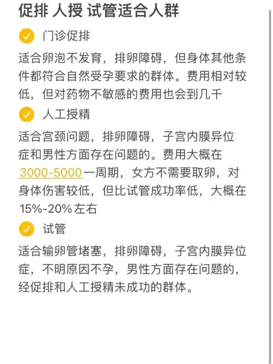 🔹人工授精适合宫颈问题,排卵障碍,子宫内膜异位症和男性方面存在问题的。费用大概在3000-5000一周期,女方不需要取卵,对身体伤害较低,但比试管成功率低,大概在15%-20%左右