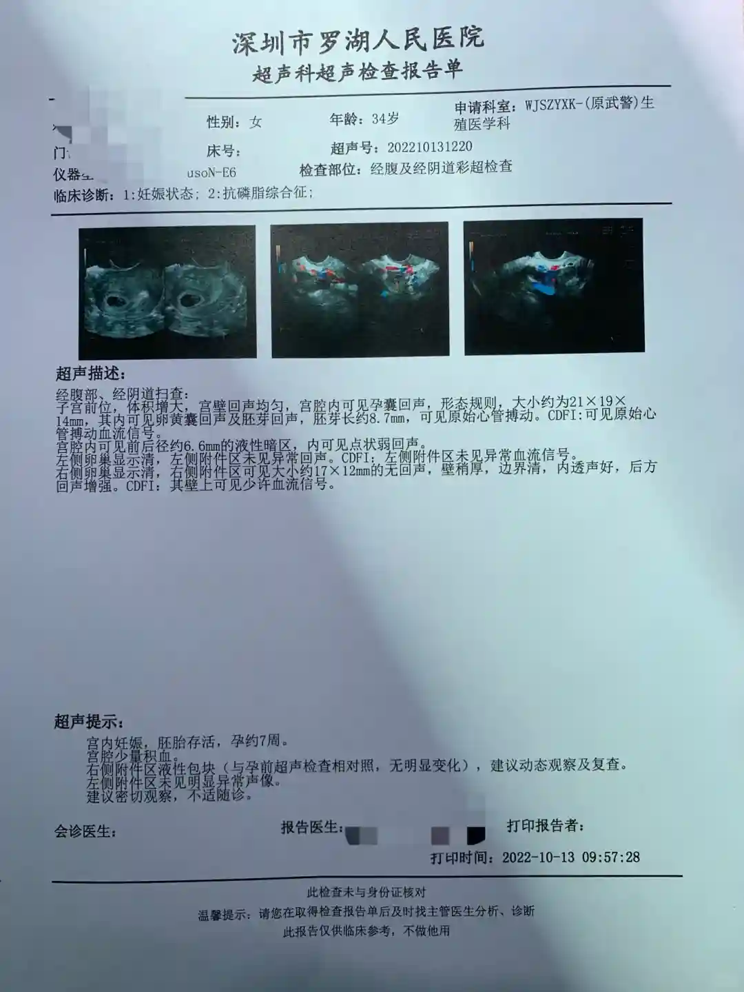 就在检查期间,我在网上看到很多宝妈强烈推荐深圳罗湖人民医院,那我就拉着老公周末开车去深圳实地考察了一下;我们一到医院,就挂得邢琪主任团队,把之前各个医院做的检查给邢主任看,然后当天开了个B超单,邢主任看了我子宫造影的片子,又考虑我年纪偏大了,就强烈建议我们做试管。
