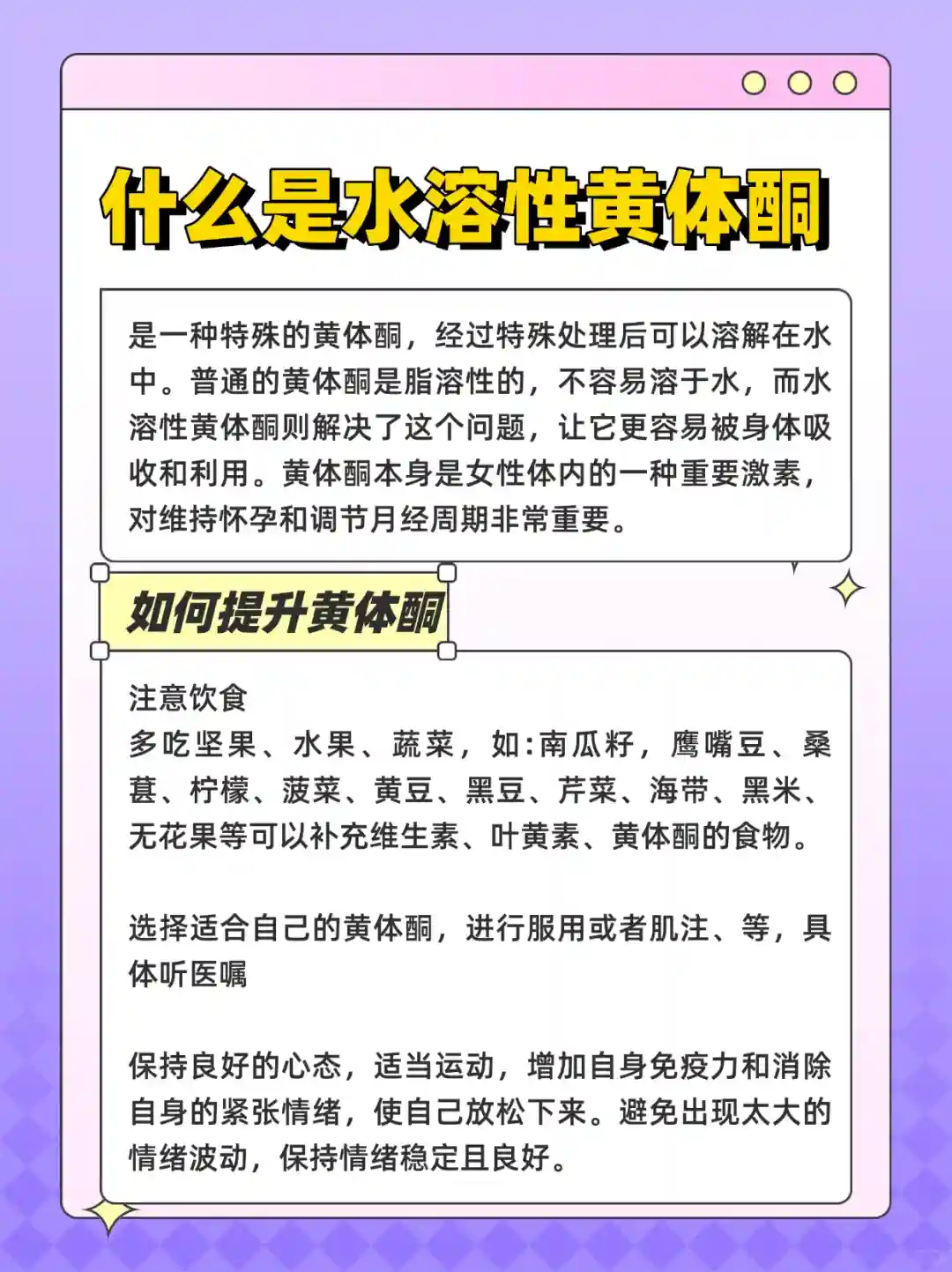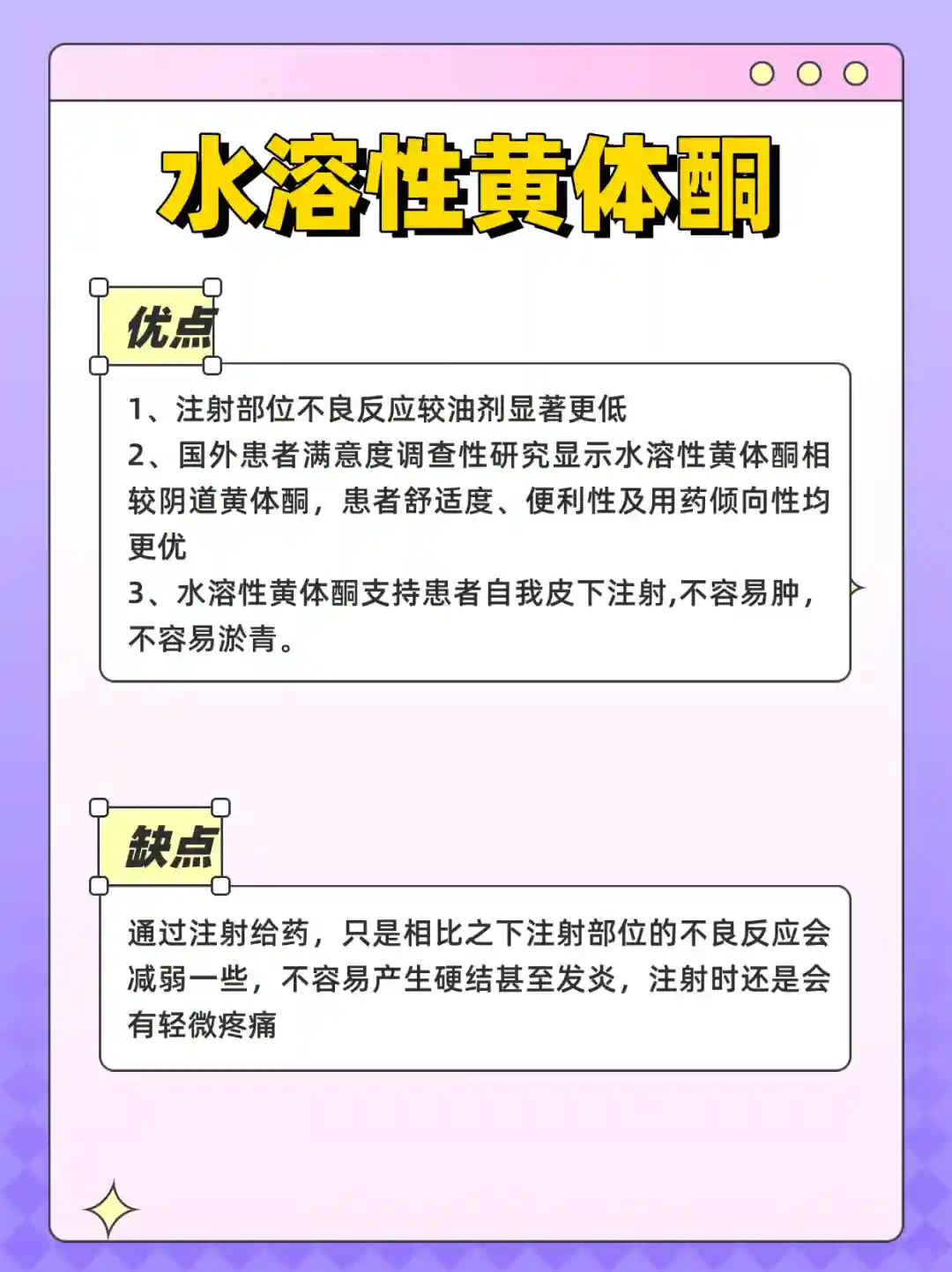 它其实是黄体酮的一种特殊剂型。普通的油剂黄体酮在体内缓释速度会慢一些,不过可以起到确切的黄体支持效果。而水溶性黄体酮就比较特别。水溶性黄体酮采用包合物工艺,打造水溶性运载系统,模拟黄体生理功能,也是一种补充黄体酮的途径。它能够更好地分散在水中,这就意味着它在人体内吸收的时候可能会更方便一些哦😉,能够快速达到药峰浓度,从而能够提供紧急支持。包括在实际使用时,注射部位的不良反应要弱一些,长期使用相对更舒适。