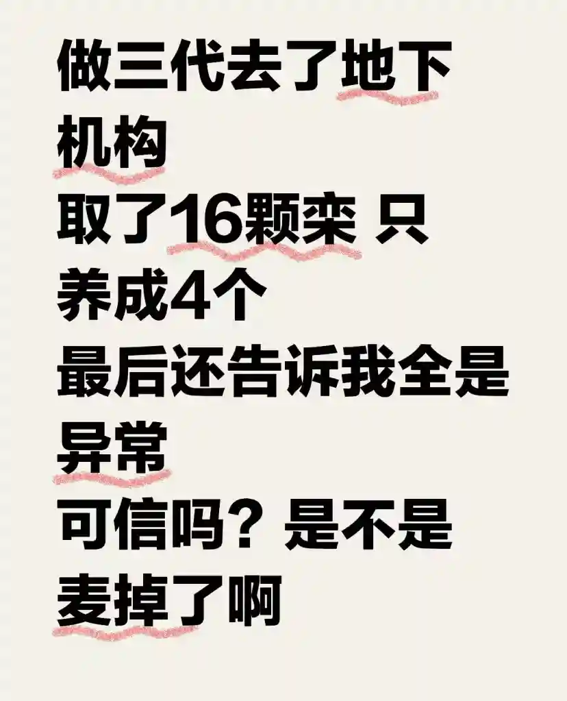 那个姐妹说,之前被带去一个地方取栾,那阵仗可大了,去取的时候手机直接就被拿走了,还被搜身。那些人还打算给她蒙上眼睛,可她当时情绪激动,坚决不让蒙,然后就被带到了郊区一个小别墅的地下室,那地方封闭得丝丝的,一点透气的地儿都没有。 在那待了差不多 20 多天吧,那边就通知说结果出来了。一看报告,取了 16 个栾,好不容易养了 4 个,结果全是异常的,就没有能移植的。