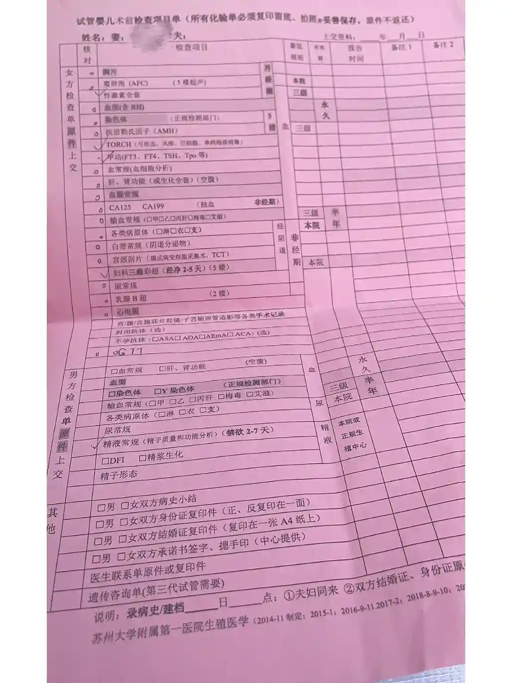 去母子的时候,把所有附一检查单(原单)都带着,给主治医生看,有些检查如果是阳的话,如果没在附一复查,要在母子复查一下,附一试管单检查单和母子试管检查单都差不多,只有几项 是要补的,女方要补 血沉 HPV 解脲支原体 戊肝 TT ,男方要补 戊肝 精桨抗体 ,女方合计 269.35 男方合计40.3。所有检查都完成切 通关,复印好,就可以去交资料拉~
