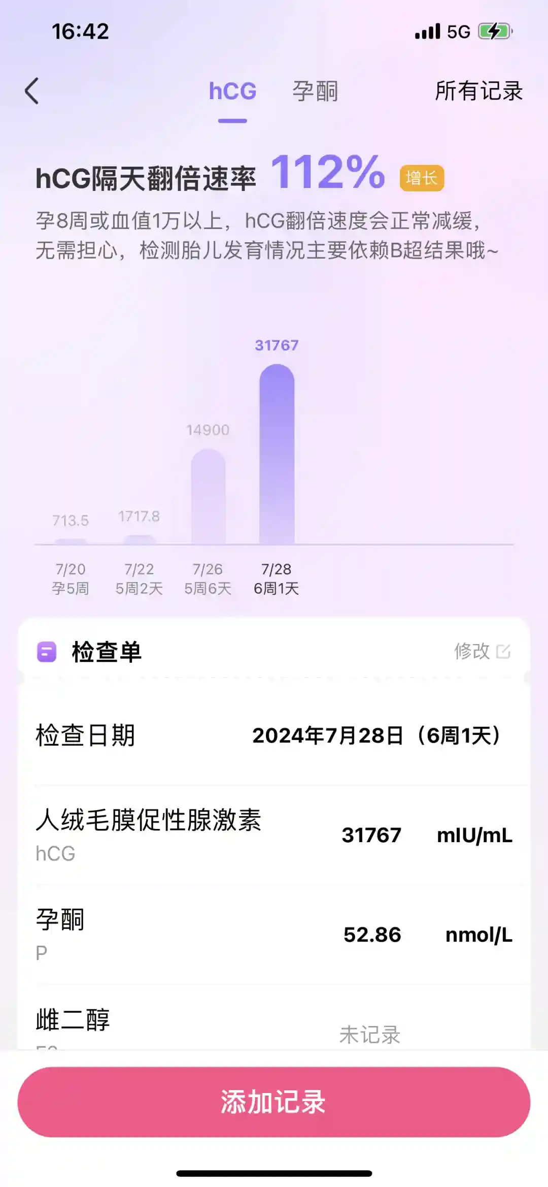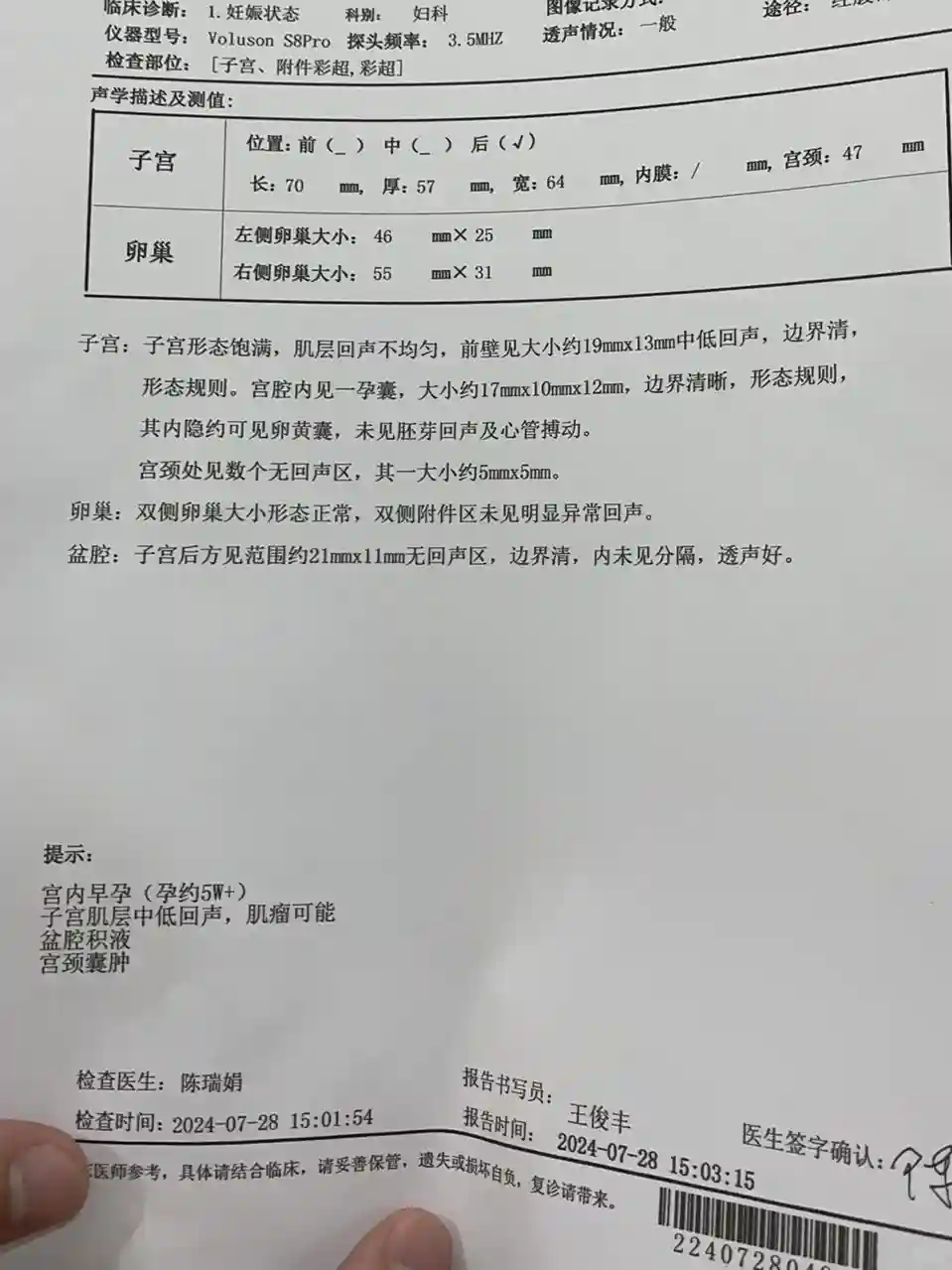 末次6.15 本人一般月经很准时,7.18号晚发现很多褐色血,以为来月经了,第二天却没有持续流血,发现不太对,19号用早早孕测了下两条杠,7.20去医院化验确认怀孕,做了B超,还太小什么都看不到,每天腹痛且有少量褐色血,之后的每天都是提心吊胆很怕是宫外孕,28号肚子疼痛加剧流鲜红色血,心想这症状肯定是宫外孕跑不掉了,赶紧找了家附近一家医院做了B超,幸运的是宝宝在宫内,且当天hcg也是翻倍,宝宝还在生长中,让10天再去复查B超确认胎心胎芽,但是有先兆流产迹象,开了保胎药。