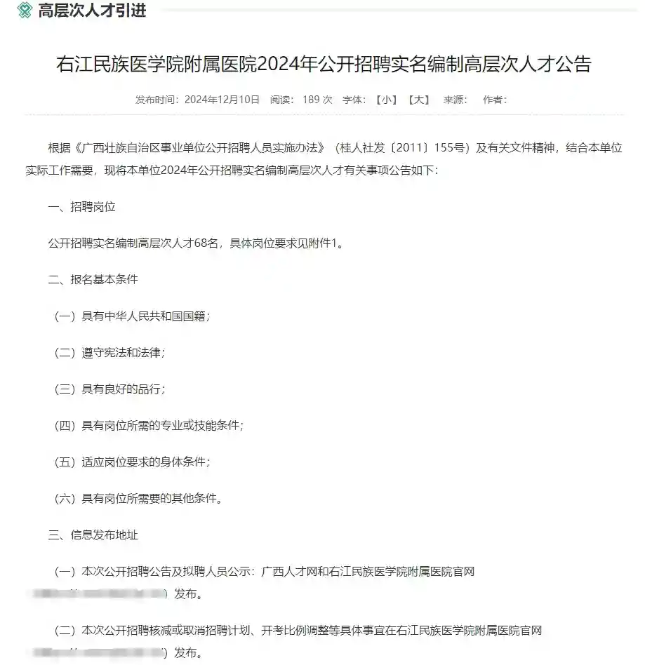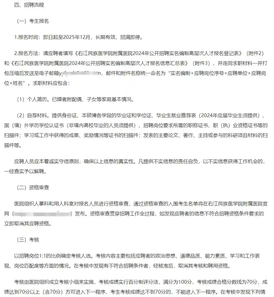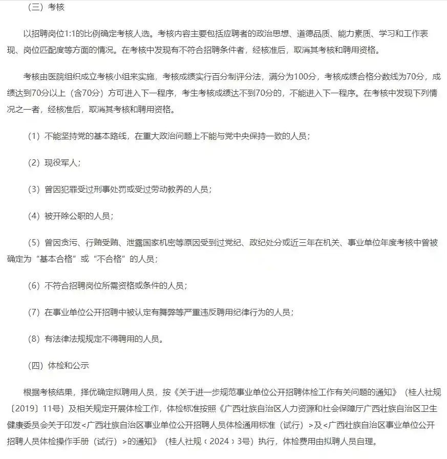 根据考核结果,择优确定拟聘用人员,按《关于进一步规范事业单位公开招聘体检工作有关问题的通知》(桂人社规〔2019〕11号)及相关规定开展体检工作,体检标准按照《广西壮族自治区人力资源和社会保障厅广西壮族自治区卫生健康委员会关于印发<广西壮族自治区事业单位公开招聘人员体检通用标准(试行)>及<广西壮族自治区事业单位公开招聘人员体检操作手册(试行)>的通知》(桂人社规﹝2024﹞3号)执行,体检费用由拟聘人员自理。#医疗编制 #医疗卫生招聘考试 #右江民族医学院附属医院 #医疗结构化面试