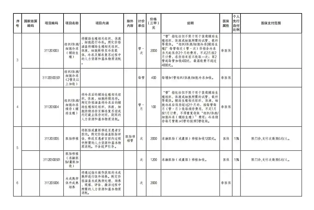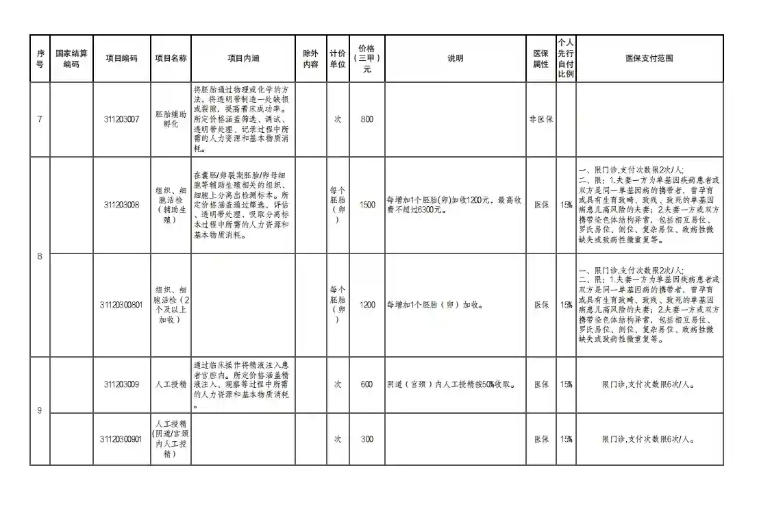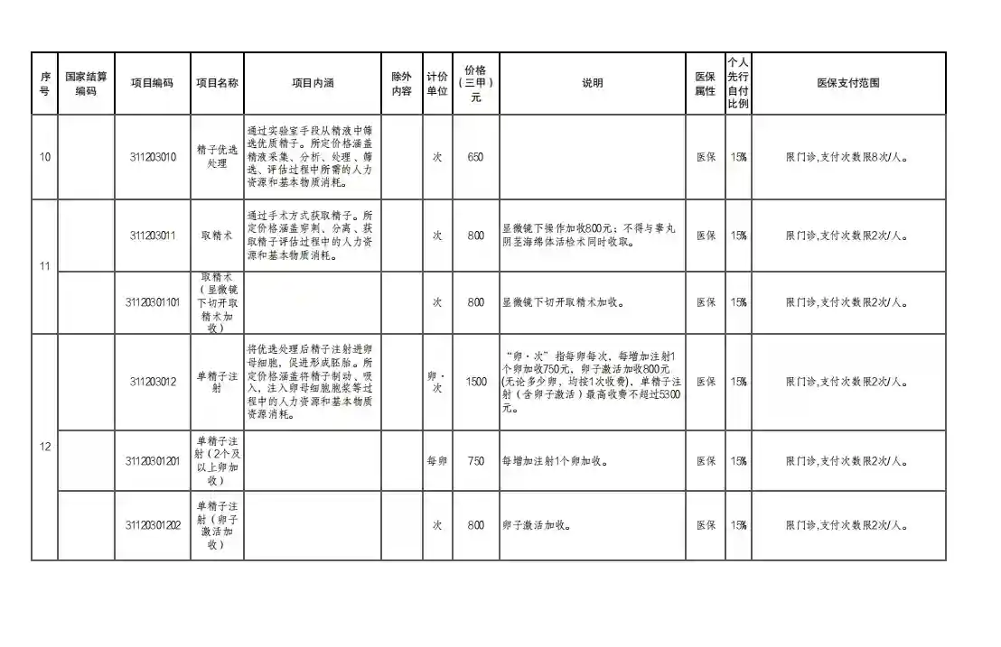 ◆12项可报:取卵术、胚胎培养、胚胎移植、组织细胞活检、人工授精、精子优选处理、取精术、单精子注射等;