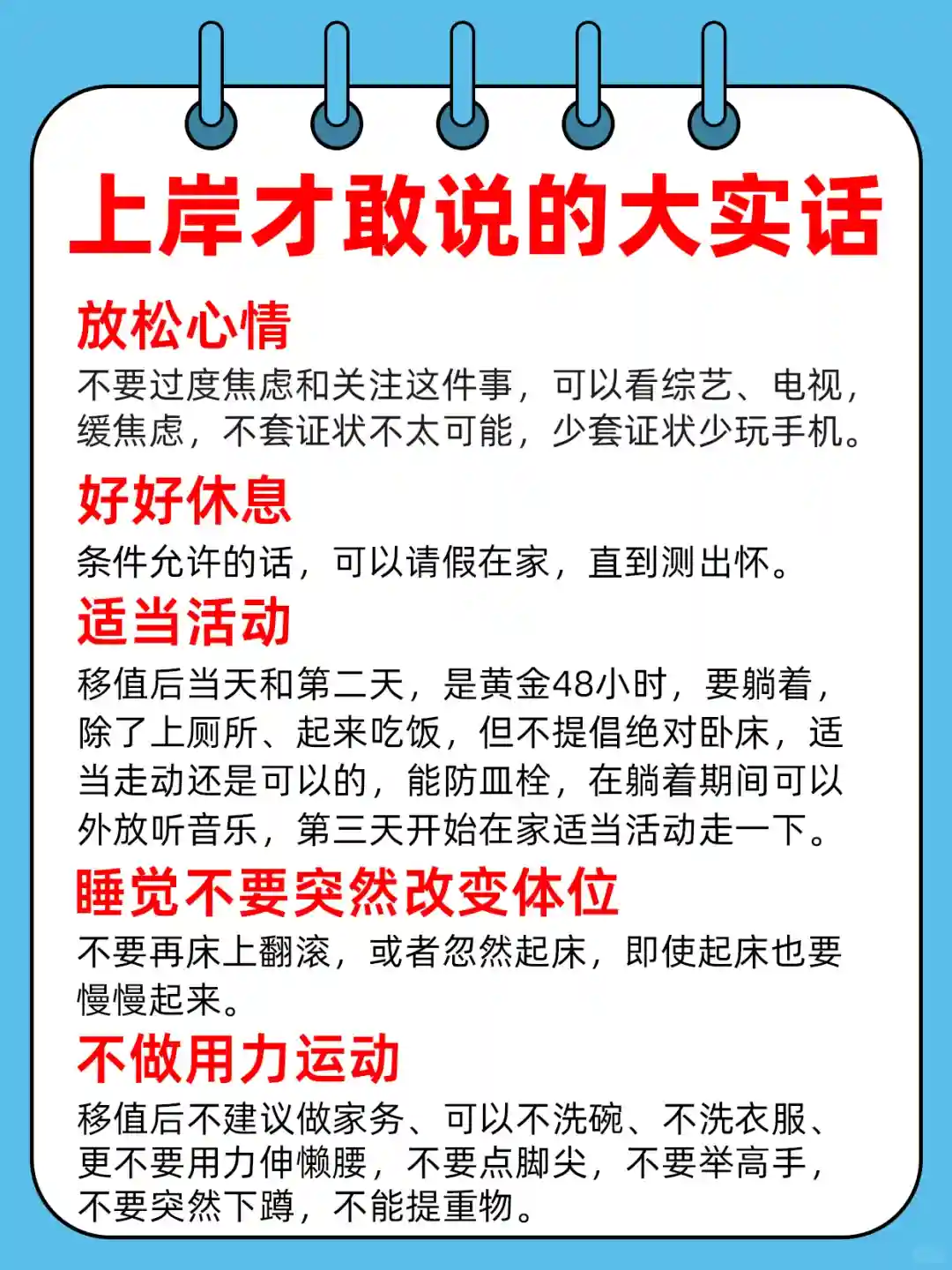 适当活动。 移植后当天和第二天,是黄金48小时,要躺着,除了上厕所、起来吃饭,但不提倡绝对卧床,适当走动还是可以的,能防皿栓,在躺着期间可以外放听音乐,第三天开始在家适当活动走一下。