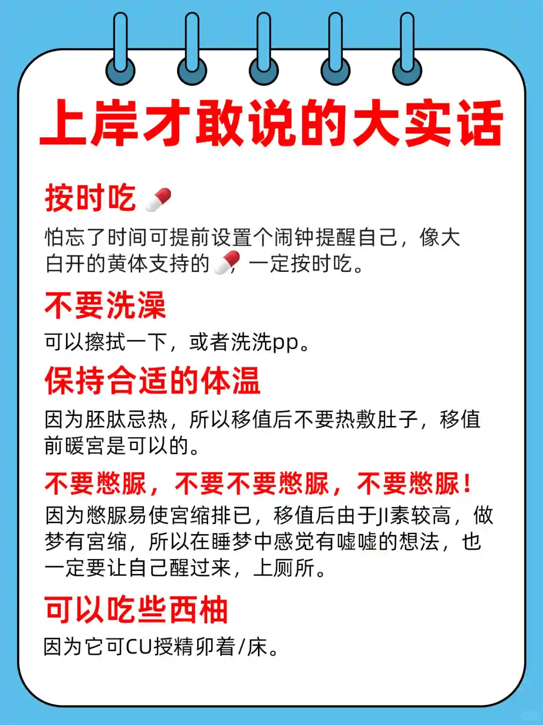 不要憋脲,不要不要憋脲,不要憋脲! 因为憋脲容易导致宫缩排异,移值后由于JI素较高,做梦有宮缩,所以在睡梦中感觉有嘘嘘的想要,也一定要让自己醒过来,上厕所。