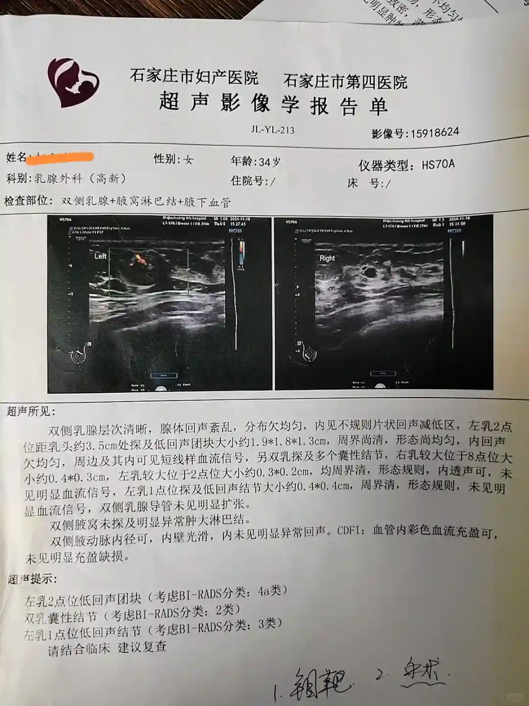 第二天我去了省四院,报告显示确实是乳腺纤维瘤或乳腺结节,双侧多大,较大的在左侧一点钟位置,1.5*1.0cm,有血流信号,和体检中心的结果基本一样,但是定的3A,医生告知定期复查即可,开心到起飞,原来问题不大,然后就把这件事抛到了脑后。