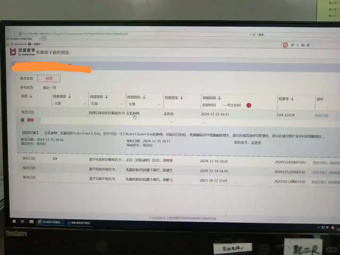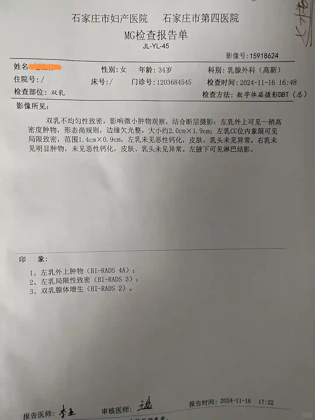 直到2024年11月份,市四院做了彩超结果显示果然长大了,1.9*1.8*1.3了,定义4A,在医生的建议下又做了个钼靶结果一样,4A。医生建议手术。综合考虑还是选择了在省四,12月份挂了省四乳腺科范主任的专家号,专家触诊了说大概率良性,但是有血流还是会长大,切了吧,当即让医生排了手术然后就给开了个乳腺彩超,两天后做彩超,出来的数据差不多。