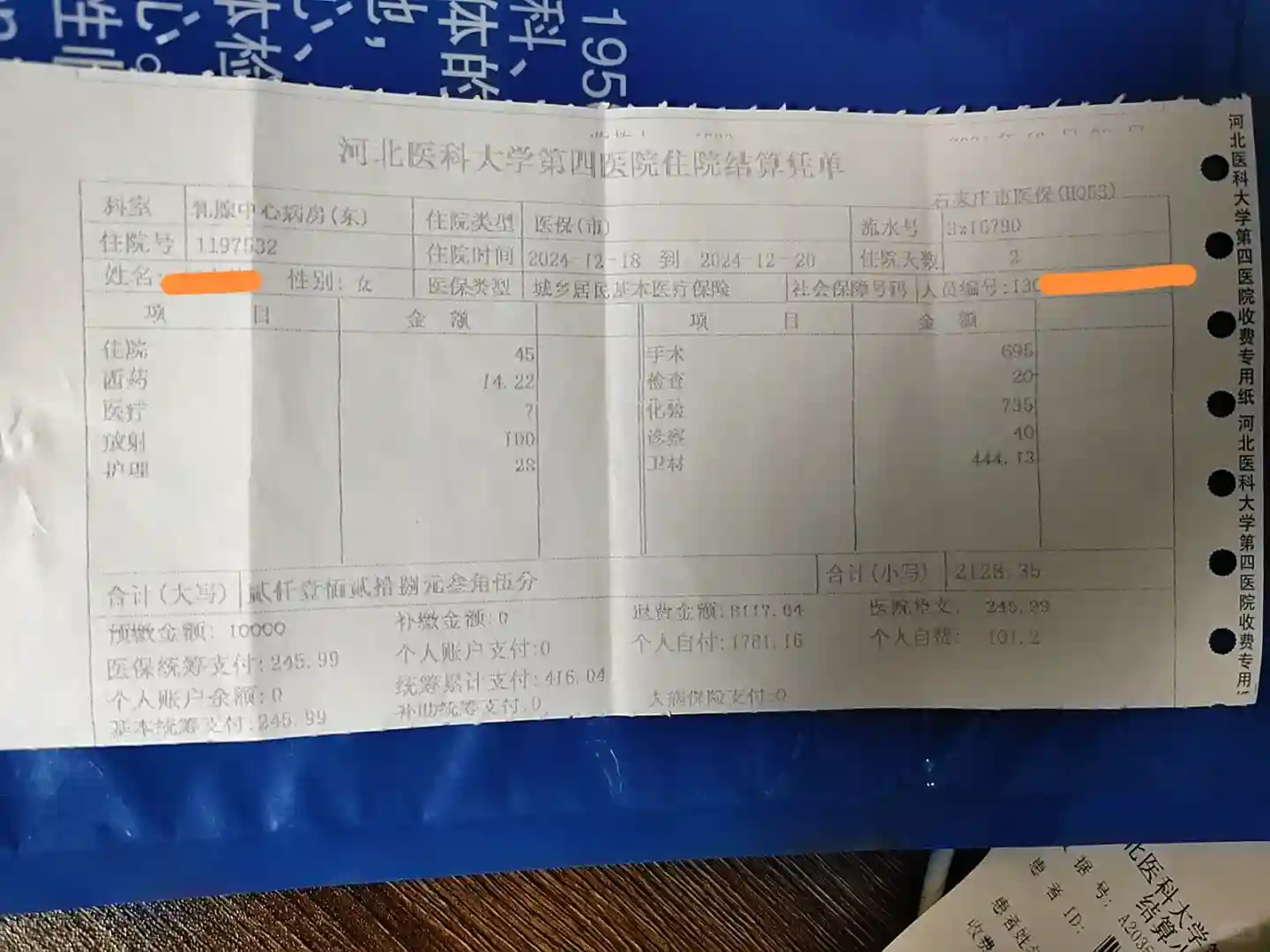 费用,不含之前做的彩超及钼靶,总共花费:2128.35元,农村合作医疗报销:245.99,自费:1882.36.