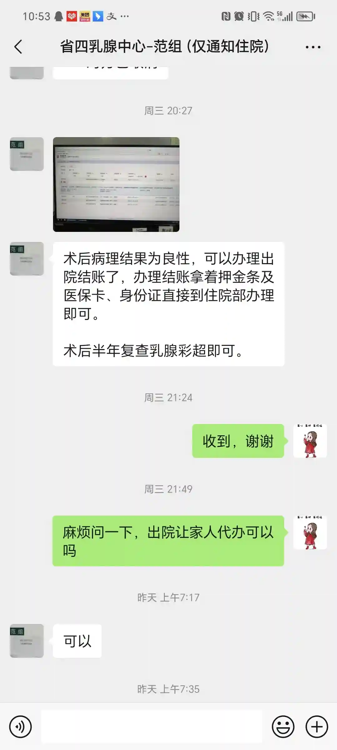第七天晚上医生给发来消息,病理结果良性,可以办理出院了,并告知半年复查即可。