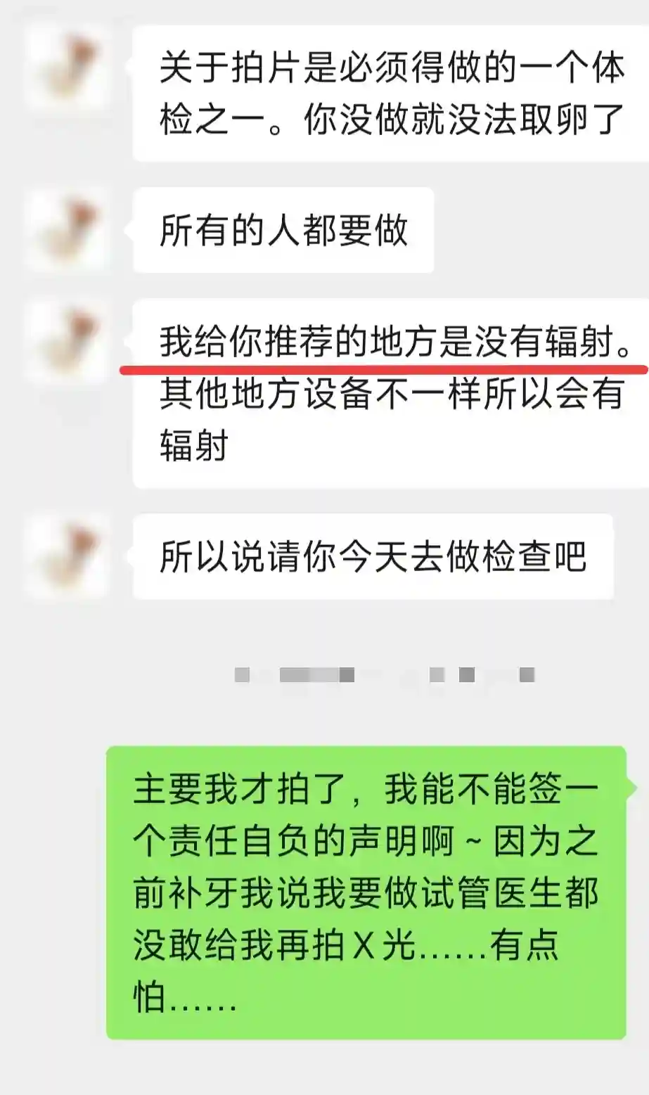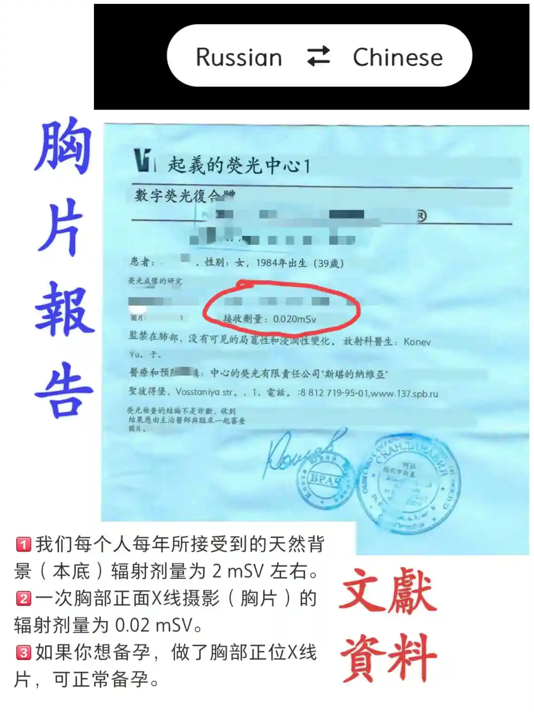 再者,居然说胸片没有辐射?你可以说辐射量小,不影响卵,但不能说“我推荐的地方没有辐射,其他地方才有”这种蠢话吧!我们祖国九年义务教育学过什么是X光好吗?!我拍完取的报告上,也标注了辐射量!真该把它拍在翻译脸上!