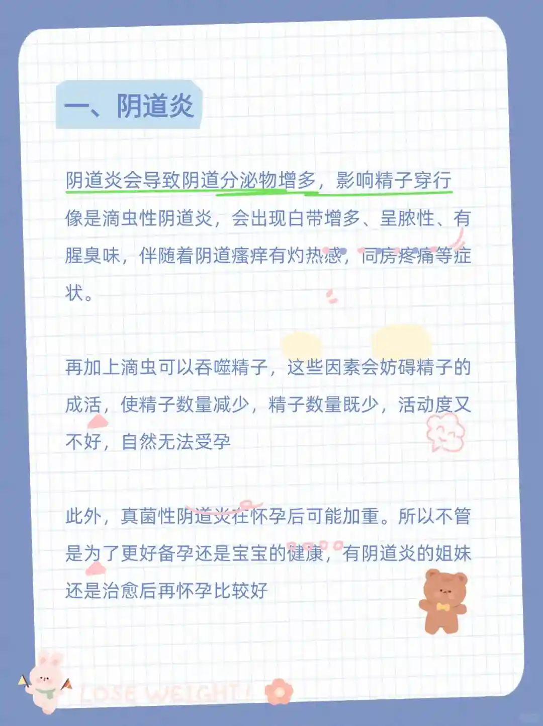 阴道炎 炎症会导致分泌物增多,精子难以“穿越”,滴虫性和霉菌性阴道炎还会让白带变得异常,可能同房小作文时会感到疼痛。建议治疗好后再考虑备孕