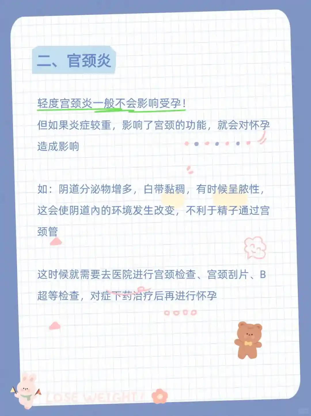 宫颈炎轻度宫颈炎通常不会影响到受孕,但如果炎症严重,可能会影响宫颈功能,阻碍精子通过。最好先去医院检查治疗再备孕哦