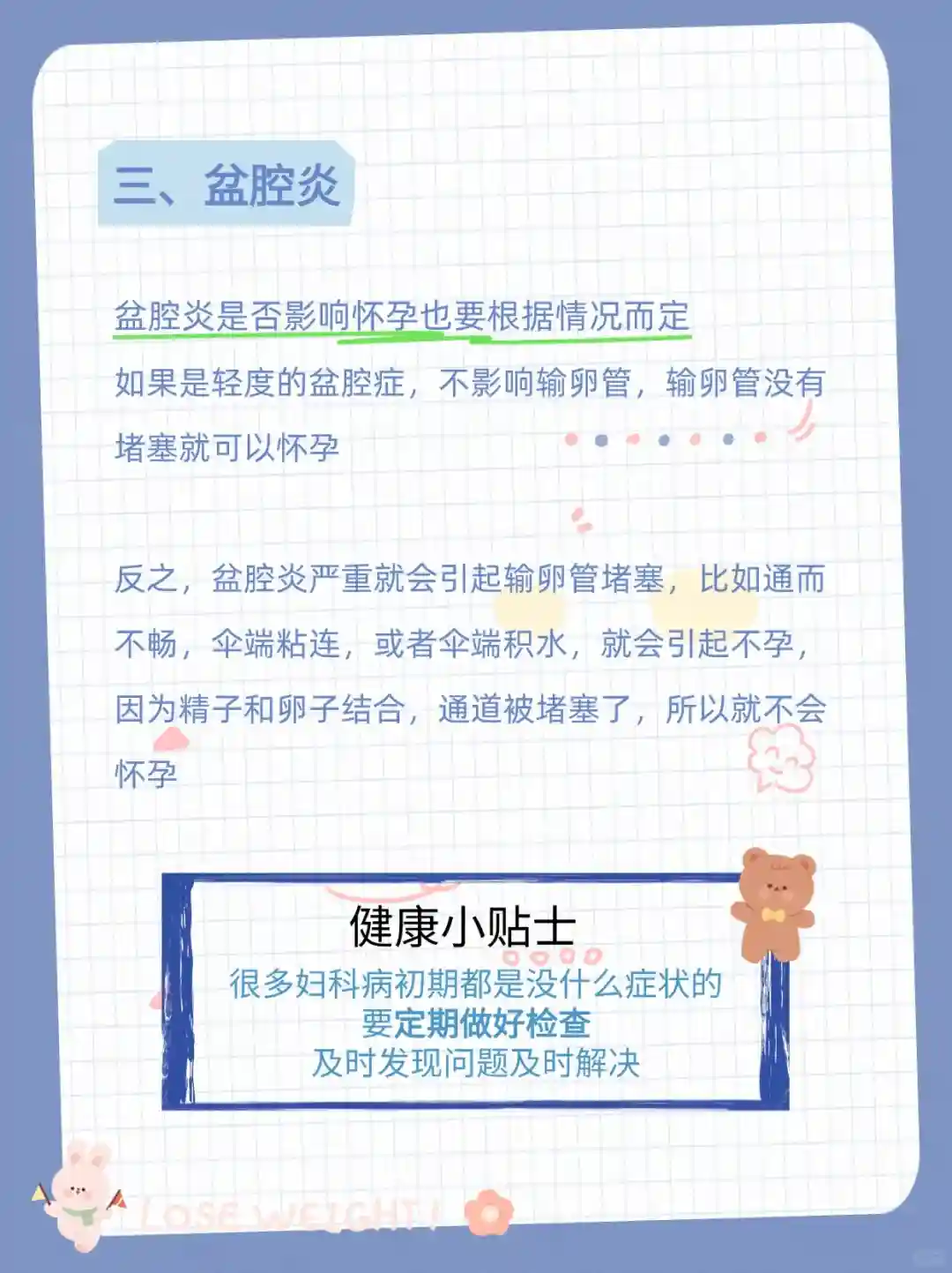 盆腔炎轻度盆腔炎一般不会影响到输卵管,但重度可能导致堵塞,从而引发不孕。定期检查非常重要
