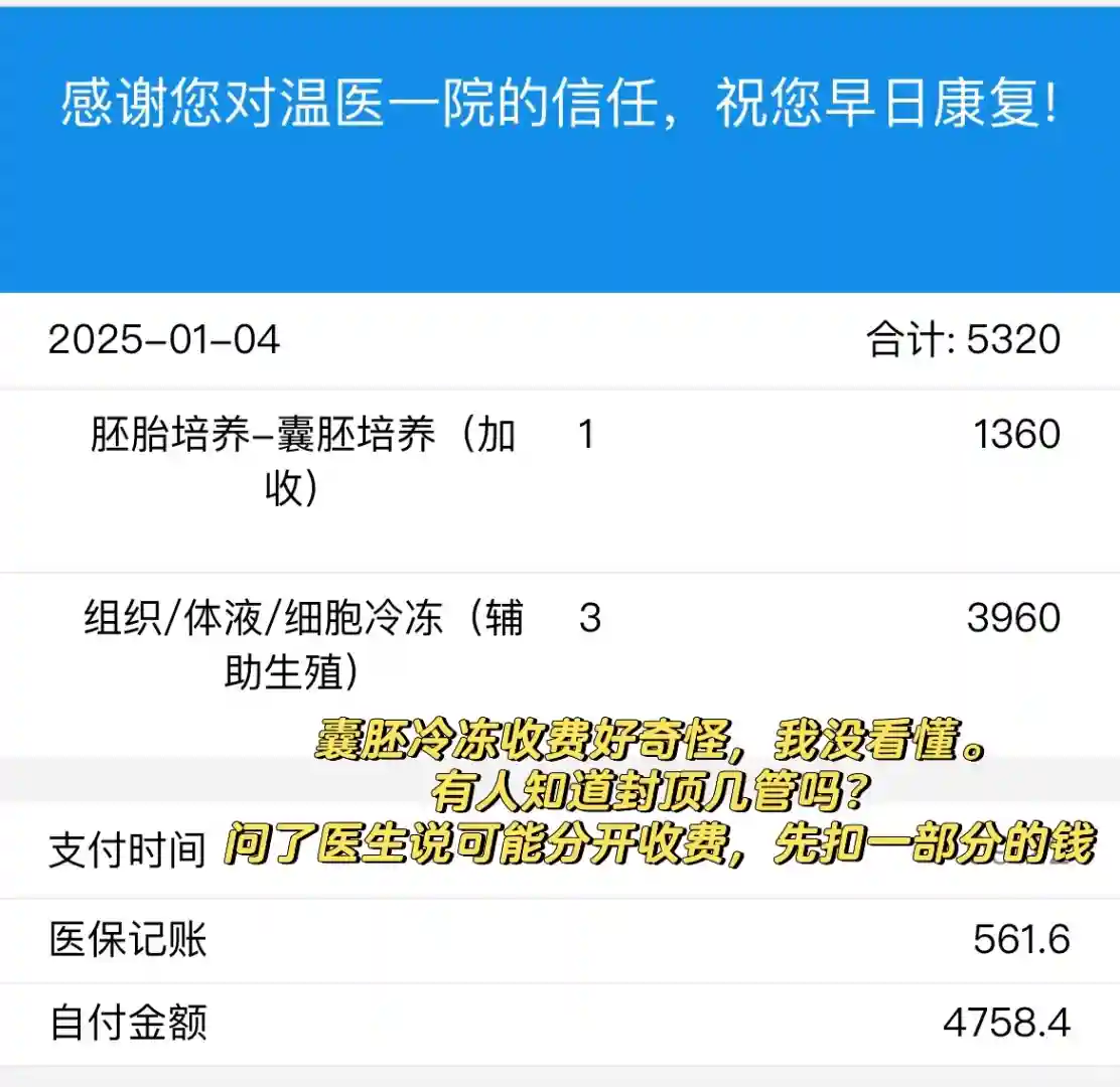 1🈷️1 取卵日第4天返院看D3胚胎,14个1级胚胎,1个4级,1个3级,剩余丢弃,全部梭哈去养囊,很紧张生怕全军覆没1🈷️4 通知养囊结果,费用好奇怪,问了护士说可能分开收费,有人知道温州附一囊胚冷冻收费封顶几管吗?